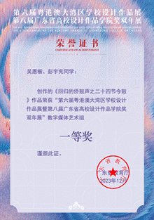 学生罗斯雲作品《青春奔赴梦想,圆梦大湾区》荣获广东省教育厅主办的第三届粤港澳大湾区大学生艺术节三等奖;