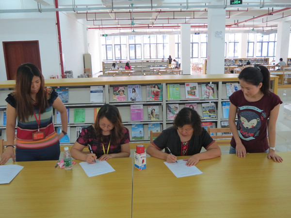 随后,王海英馆长与欧阳群英主任再续签订了《广东工程职业技术学院图书馆社区服务协议书》,并带领参观了新图书馆。