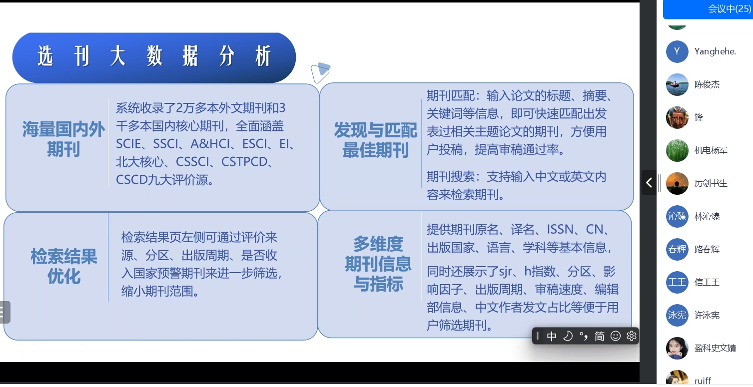 5月8日的“青梨AI科研服务助手使用方法”专题讲座中,盈科千信公司的王泽龙老师向大家介绍了青梨AI科研服务助手,它依托于微信小程序和学科服务群,以全新形式为科研教学人员打造智能高效的专属学科服务,使老师们在科研发文、文献调研、学术追踪中遇到的问题迎刃而解,提供更加强大的学术资源保障。讲座内容切合我校教师的需求,获得参会教师的一致好评。