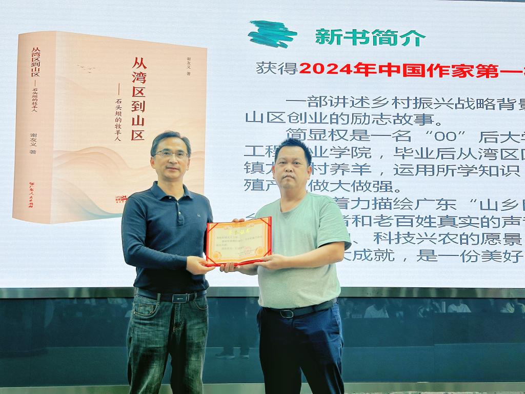 随后,广东省报告文学学会副会长兼秘书长谢友义带来了题为《文学赋能圆创业梦想》的主题分享。他结合自己的创作经历,特别是2024年中国作家第一村创作工程扶持项目、长篇报告文学《从湾区到山区——石头坝的牧羊人》的采访和创作过程,深情地描绘了简显权如何返乡创业、如何在艰难的环境中坚守使命与责任,将青春绽放在大山深处,成为乡村振兴的楷模和新时代的平民英雄。