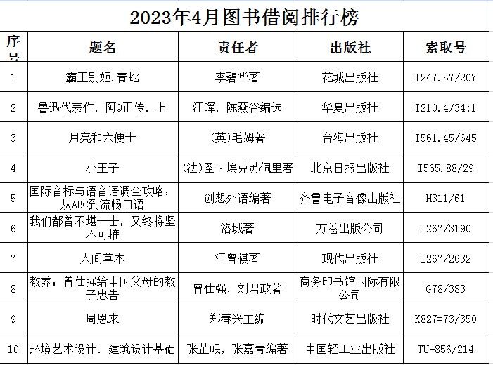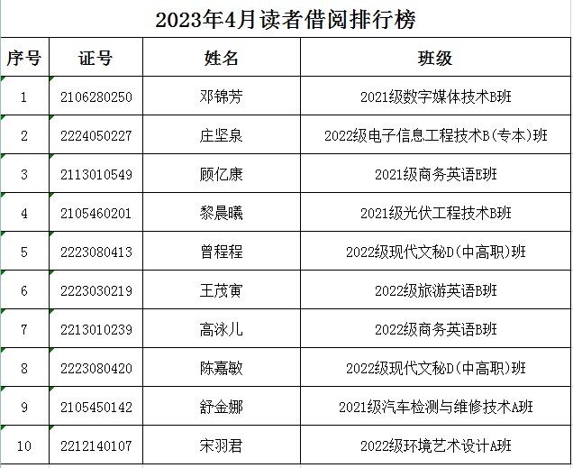 图书馆2023年4月读者借阅排行榜和图书借阅排行榜出炉啦,看看哪几本书借阅量最大,或者来这里找找有没有你想借的书!更多活动信息和相关通知请读者们通过关注“广东工程职业技术学院图书馆微信公众号”获取。