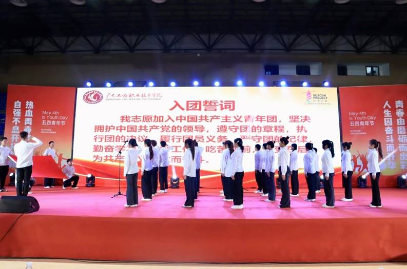 大会在雄壮的国歌声中拉开帷幕。首先,大会上宣布了新团员名单,各二级学院团委书记为新团员颁发团徽徽章和团员证,新团员代表面向团旗进行了庄严的集体宣誓。
