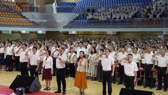 叶忠明书记带领全体教职工面对国旗进行教师宣誓。
