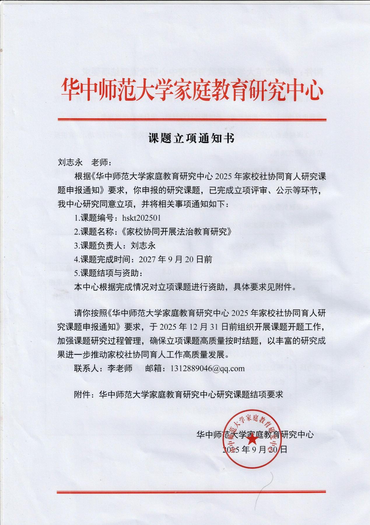 我校体育健康学院刘志永老师主持的课题《家教协同开展法治教育研究》成功获批2025年度华中师范大学家庭教育研究中心课题立项;据工作人员称:该课题获专家评委的一致认可,评分最高,因而获得“hskt202501”课题编号。
