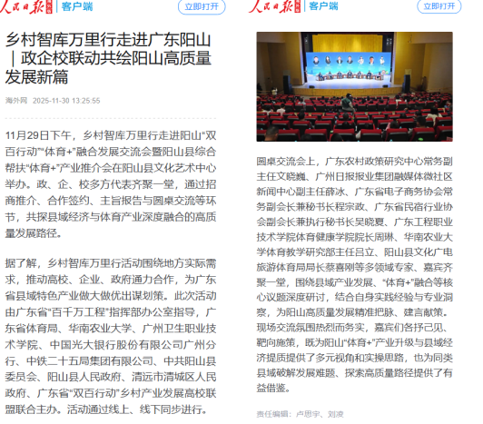 当天下午,学院深度参与乡村智库万里行走进阳山“双百行动”“体育+”融合发展交流会暨产业推介会。作为联合协办单位,学院以政企校协同合作为纽带,以党建共建为支撑,在服务区域经济发展、扩大办学影响力方面迈出坚实步伐。