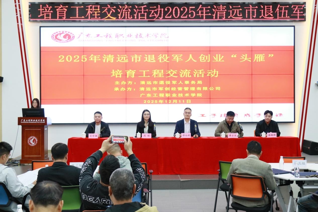 12月12日,2025年清远市退役军人创业“头雁”培育工程交流活动圆满落幕。此次活动由清远市退役军人事务局主办,广东工程职业技术学院体育健康学院等联合承办,汇聚清城区、连州市等55名优秀军创企业家,通过政策解读、经验分享、实地考察等多元形式,搭建起赋能退役军人创业、助力退役军人创业“头雁”领航发展、带动区域经济发展的坚实平台。