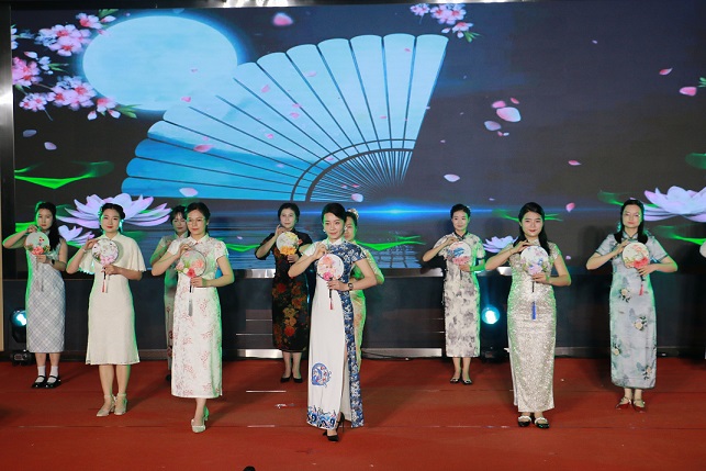 礼赞新时代篇章以《体育健康正起航》歌舞表演开场,改编歌词展现学院的学科设置和健康魅力;朗诵《匠心育人 青春筑梦》表达每一位教育工作者的初心与使命;三句半《“她”力量,戏曲中绽放》以独特的艺术形式,展现了新时代女性在传统戏曲中的独特魅力与力量。李丹等21位女教职工带来的旗袍秀《师韵华裳》压轴登场,锦袍素雅婉约款步生姿,团扇轻摇漾开书香雅韵,纸伞旋舞勾勒烟雨诗情。三尺讲台上的严谨师者化身霓虹光影中的东方佳人,绽放三尺讲台外的别样风华。《最炫民族风》、《上春山》、《真的爱你》三个男声小组唱表达出对女性的敬意与赞美。