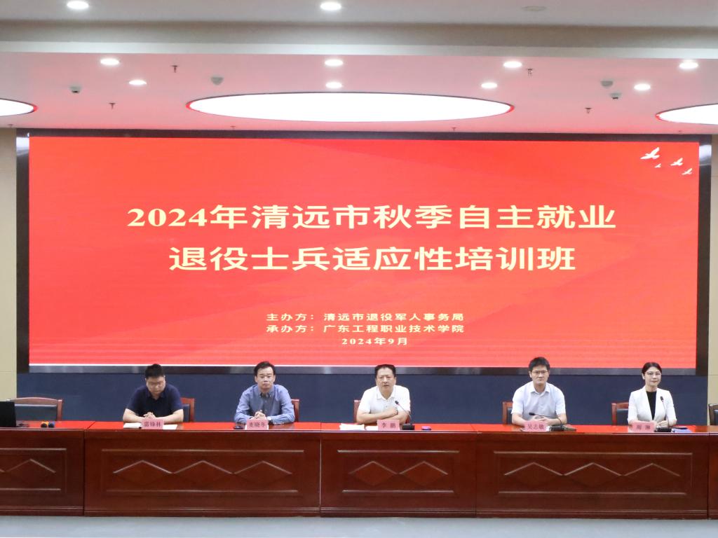 2024年9月24日上午,清远市秋季自主就业退役士兵适应性培训班开班仪式在广东工程职业技术学院行政楼报告厅举行,本次培训由清远市退役军人事务局主办,广东工程职业技术学院承办。清远市退役军人事务局党组成员、副局长李鹏,广东工程职业技术学院党委委员、副校长吴志敏,广东工程职业技术学院酒店管理学院院长麦晓冬,清远市退役军人移交安置与就业创业科科长雷锋林出席此次会议,来自清新区、英德市、连州市、连山县、连南县、阳山县的150名退役士兵参加本次开班动员会,本次会议由广东工程职业技术学院酒店管理学院党委副书记、副院长周琳主持。