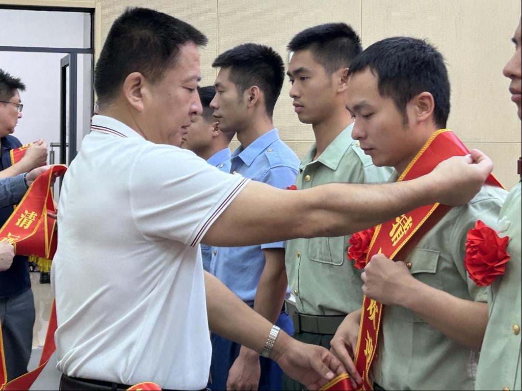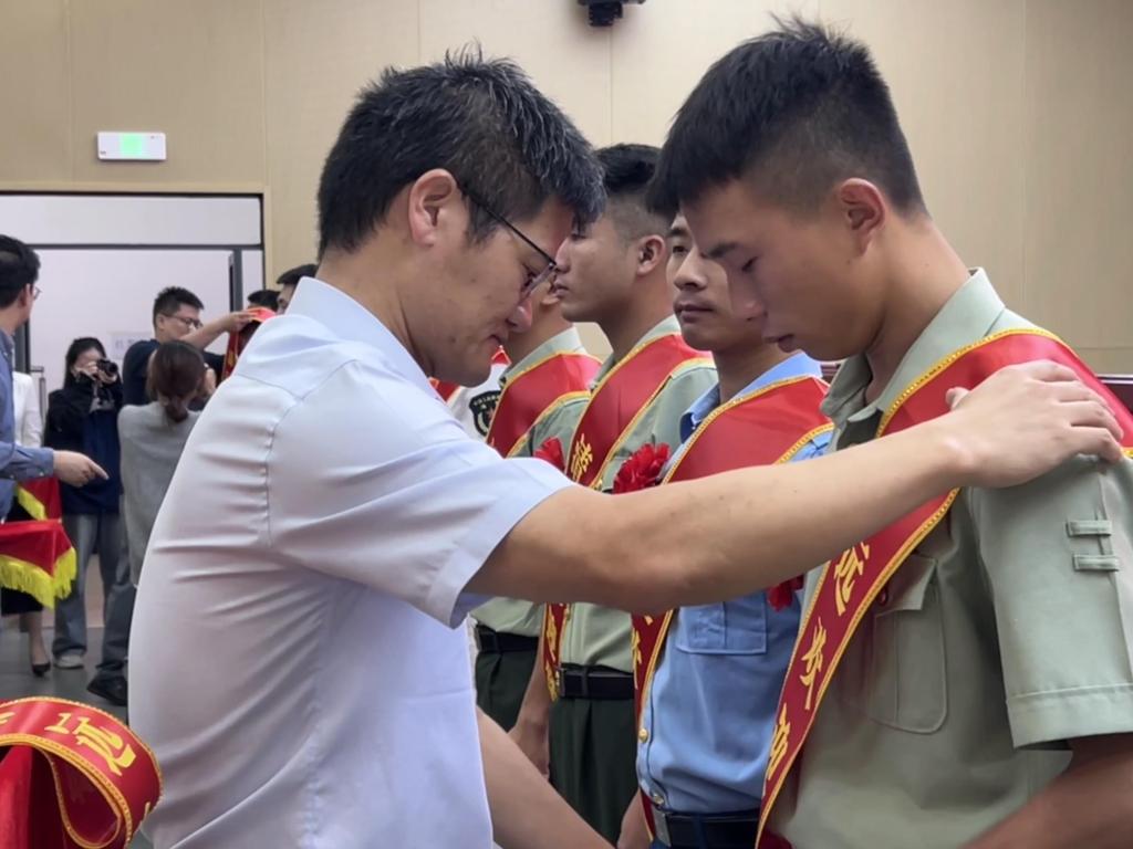 会上,主席台就座的领导为退役士兵代表佩戴欢迎绶带,并合影留念。