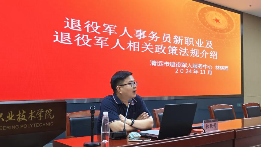 吴志敏副校长向培训学员介绍了广东工程职业技术学院的办学历史、办学条件和学校在退役军人学历提升、适应性培训、就业创业、职业技能培训等方面的具体做法,学校也将发挥广东省退役军人教育培训(实训)示范基地作用,做好培训班课程设置、选派好师资队伍、做好培训服务管理,为清远市退役军人提供规范、专业、周到的服务,助力退役军人快速融入社会,实现个人价值和社会价值的双重提升。