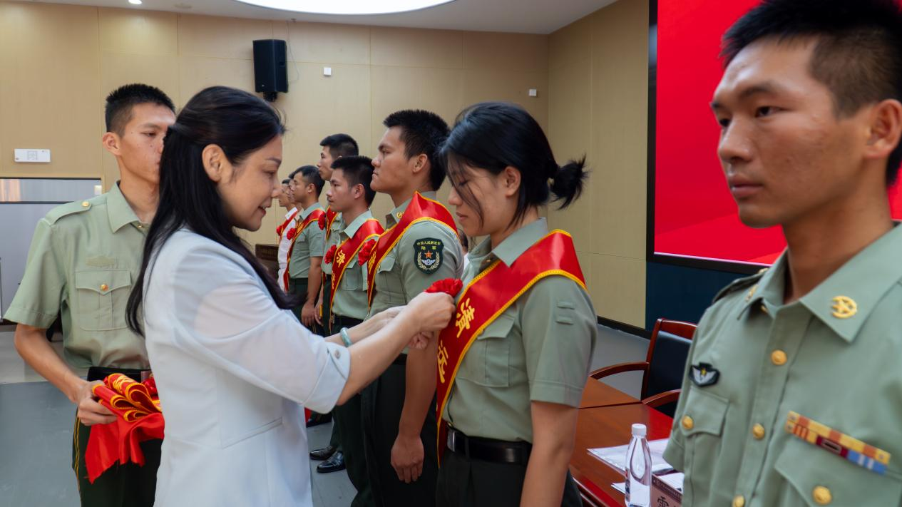 在庄严的国歌声中,开班仪式拉开帷幕。周琳院长在致辞中表示:“学校作为广东省退役军人教育培训(实训)示范基地,将充分发挥高校资源优势,为退役军人转型提供全方位支持。希望各位学员珍惜学习机会,树立终身学习理念,继续发扬军人能吃苦、能战斗的优良作风。”雷锋林科长对光荣返乡的退役士兵表示热烈欢迎,并指出:“此次培训是帮助大家实现角色转变的关键举措。退役军人是社会宝贵的人才资源,希望大家通过培训提升就业创业能力,为清远市经济社会发展贡献新的力量。” 在开班仪式中,周琳院长为退役军人代表佩戴欢迎绶带。