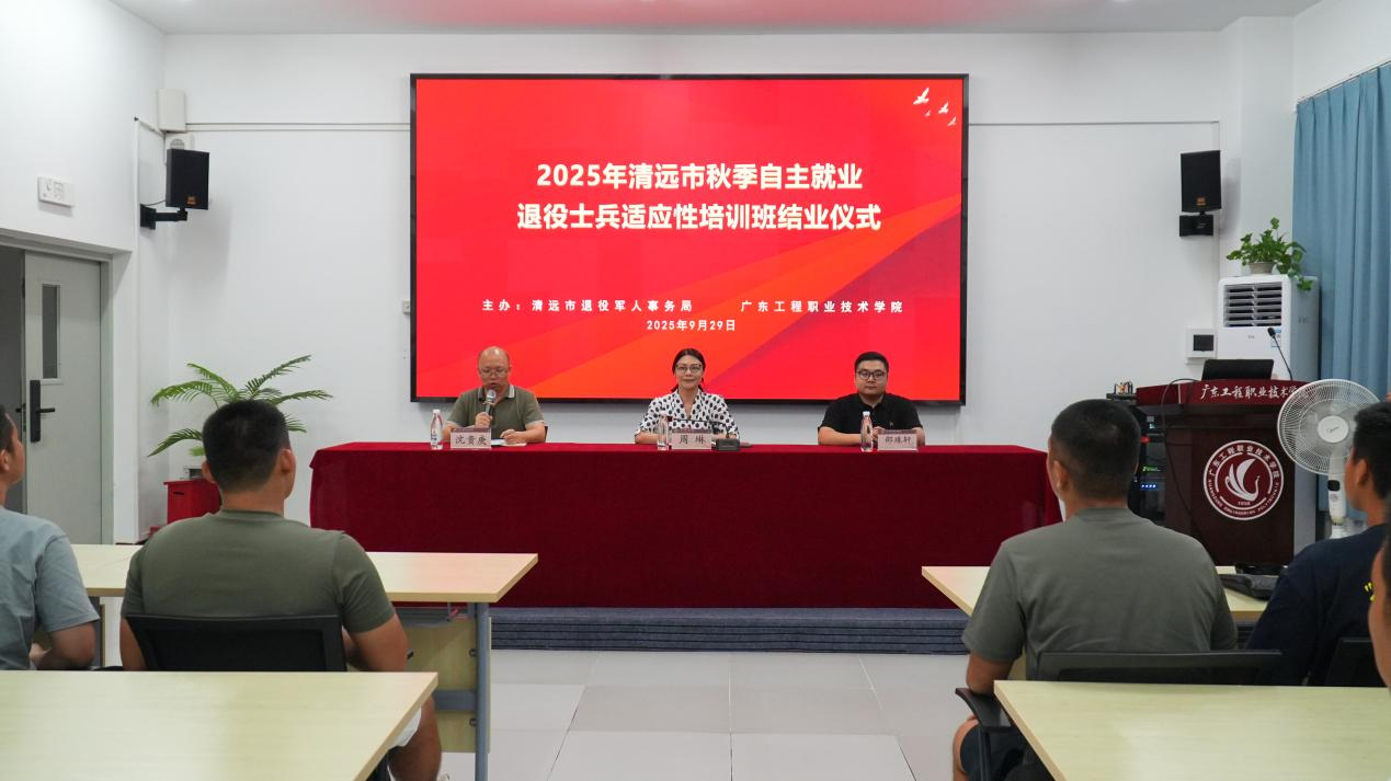 9月29日,培训班结业仪式隆重举行。广东工程职业技术学院体育健康学院院长周琳、继续教育学院学历提升和终身教育科科长邵珠轩出席结业仪式。 周琳院长在结业总结中表示:“希望各位退役士兵能永葆军魂本色、主动适应社会和勇敢接受挑战。希望在部队锤炼出的纪律性、执行力和责任感融入今后的工作和生活中,无论走上何种岗位,都能展现出退役军人‘退役不褪色’的良好精神风貌,为清远市的经济社会发展,特别是‘百千万工程’的建设,持续注入坚实的退役军人力量。”邵珠轩科长为培训合格的退役士兵颁发了结业证书,对他们在培训期间的表现给予充分肯定。手持结业证书的退役士兵们脸上洋溢着自豪的笑容,标志着他们已完成从军营到地方的第一课。 清远市退役军人事务局相关负责人表示,通过此次培训,进一步推动了退役军人由军事型人才向经济社会建设型人才的转变,助力他们在新岗位上继续发光发热。