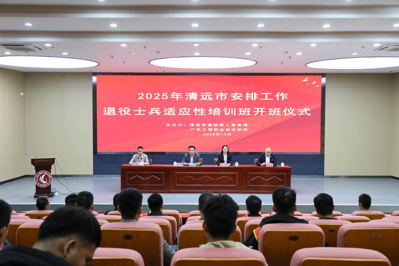 12月1日,培训班开班动员仪式在办公楼报告厅举行。清远市退役军人事务局党组成员、副局长、二级调研员李鹏、广东工程职业技术学院体育健康学院院长周琳等出席。在开班致辞周琳指出:“从‘军营’到‘职场’,这是退役士兵一次重要的人生转折,更是一场全新的征程,本次培训班的意义是帮助退役士兵顺利完成角色转换、快速适应地方工作”。在动员讲话中,李鹏副局长强调:“本次培训精准对接已就业退役士兵的‘岗位提升’需求,课程设置既贴合地方经济发展实际,又突出实用性和针对性,为退役军人扎根岗位、成长成才提供了有力支撑,希望大家珍惜学习机会,把军队优良作风转化为履职尽责的实际能力,在新岗位上续写新的荣光”。