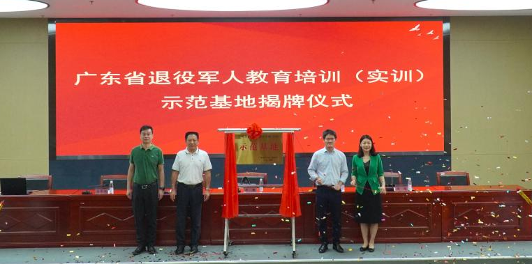 开班仪式上,主席台上领导为退役士兵学院佩戴欢迎绶带,并为广东省退役军人教育培训(实训)示范基地揭牌。