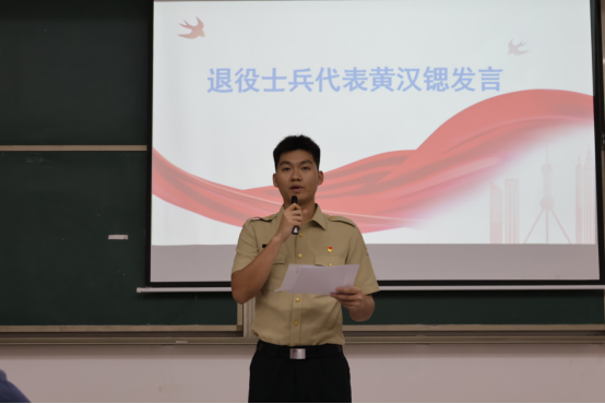 其次是退役士兵代表黄汉锶发言,他希望退役士兵们能永葆初心,珍惜战友情谊,要把在部队获取的珍贵的知识保留并传承下去。他说军旅生涯是美好的回忆,也是退役士兵们最重要的精神财富,他希望各位退役士兵不忘当代青年的使命任务,牢记要传承的精神与责任担当,回到地方,继续发挥退役士兵的力量,发光发热。