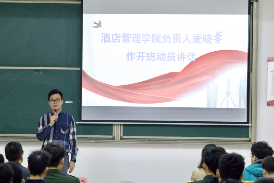 图2 酒店管理学院负责人麦晓冬作开班动员讲话