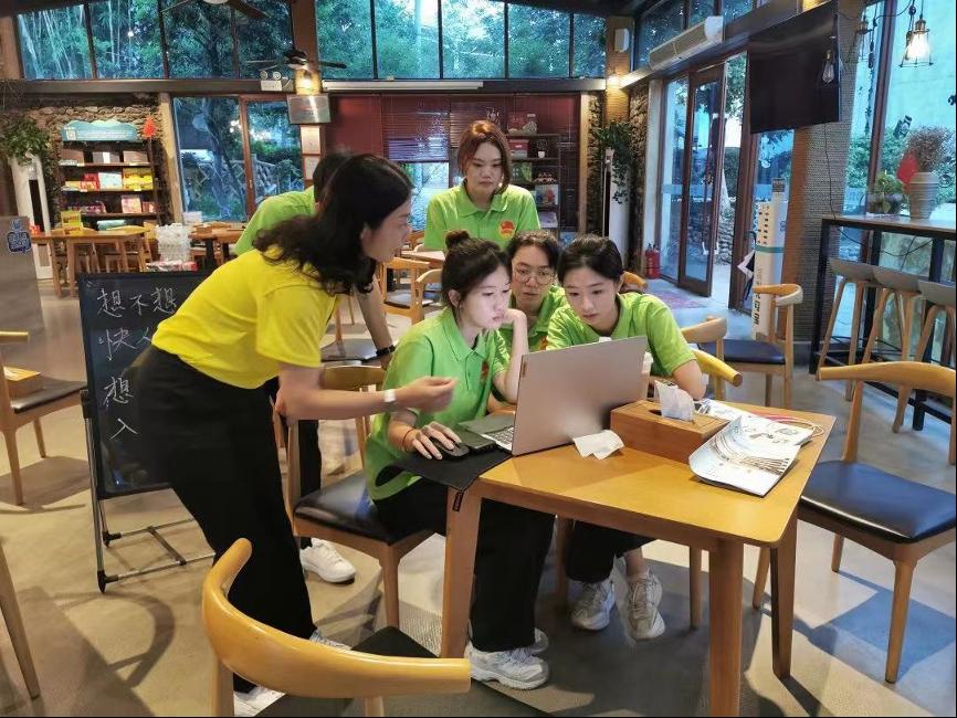 第一支队伍为校级队伍,共10名同学,前往英德市浛洸镇鱼咀村调研乡村旅游,帮助村民宣传当地民宿。鱼咀村民宿以其独特的乡村特色、宜居的环境以及温馨的服务受到游客的青睐,并且以产业帮扶为先导的“4+X”帮扶模式成为乡村振兴学习的案例。不仅可以提供舒适的住宿环境,还能让游客亲近大自然、感受乡村生活。为此,队员们利用自己的专业知识利用互联网平台对民宿进行直播,利用网络打开鱼咀民宿的知名度,为民宿进行宣传推广,成功地提高了直播间的曝光度以及文旅的产品销量,助力鱼咀村及鱼咀民宿更好地发展。剩下的几天,队员们进行了走访农户调研、师生现场会议研讨、民宿内部环境创设、民宿管理数字化升级等活动。鱼咀村村委会驻村第一书记邹家成组织队员们学习党的二十大报告,他表示青年强,则国家强。当代中国青年生逢其时,施展才干的舞台无比广阔,实现梦想的前景无比光明。广大青年要坚定不移听党话、跟党走,怀抱梦想脚踏实地,敢想敢为、善作善成,要立志做有理想、敢担当、能吃苦、肯奋斗的新时代好青年,让青春在全面建设社会主义现代化国家的火热实践中绽放绚丽之花。最后,邹书记还介绍了鱼咀村的由来和农村特色产业发展,希望我校学生能常态化关注农村经济发展和助力乡村振兴事业。