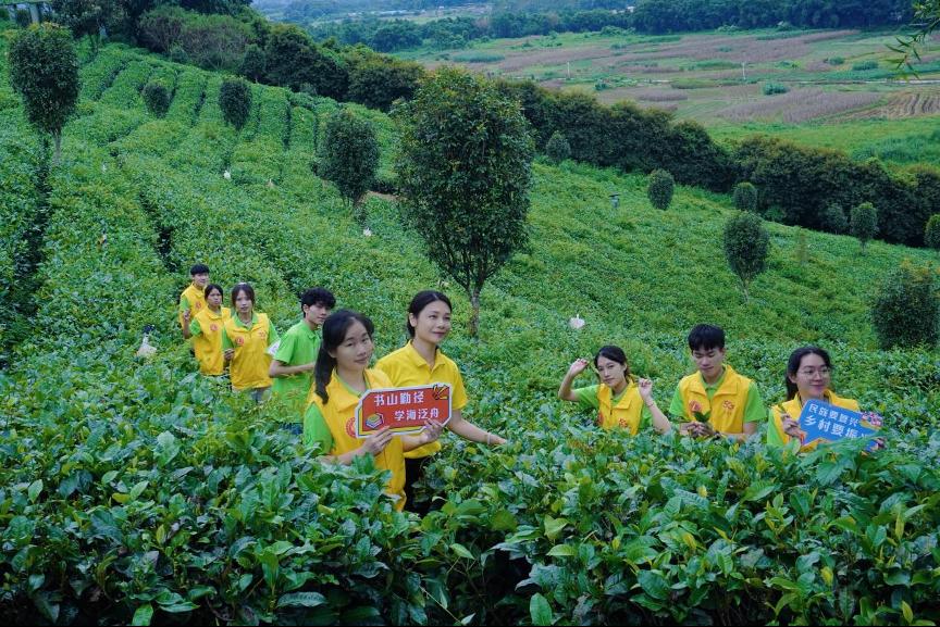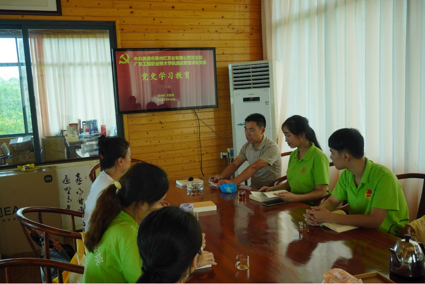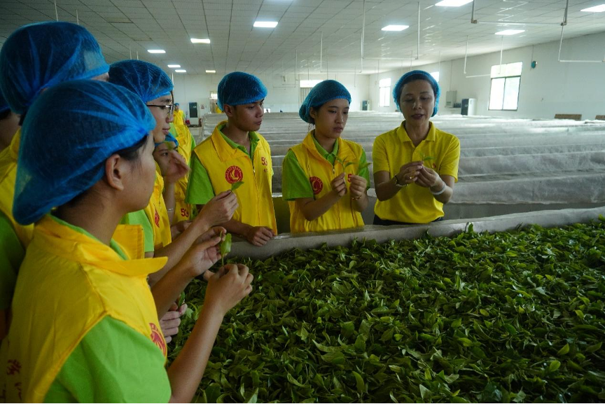第二支队伍为院级队伍,共5名同学,前往英德市英州红茶业有限公司。为进一步了解并宣传清远五大百亿农产品之一的英德红茶。参观调研前由英德市英州红茶业有限公司办公室主任吴庆尚组织引导团员们学习党史、了解新中国史的重大事件、重要会议、重要文件、重要人物,了解我们党领导人民进行艰苦卓绝的斗争历程,了解我们党的光荣传统、宝贵经验和伟大成就,在深入学习和不断领悟中,弄清楚我们从哪里来、往哪里去,弄清楚艰苦卓绝是什么,做到知史爱党、知史爱国,做到常怀忧党之心、为党之责、强党之志。并且提出清远市“雁归计划”以及新媒体时代对于清远市五个百亿农产品影响。引导大学生团队树立正确的思想觉悟,积极向党组织考拢。在五天的实践活动中,队员们深入了解了茶叶制作的全过程,在当地茶农以及英德市英州红茶业有限公司电商主管陈亚汉的科普教学下,队员们学到了“茶叶采摘标准、茶文化历史、茶叶的种类”等优秀的传统文化知识。调研期间,队员们在茶园里学习采茶的要求与标准、茶叶的种类区分;在车间里深入了解茶叶的制作过程;在茶桌前学习茶艺。从采摘、萎凋、做青、摇青 、杀青炒青、揉捻、烘干、挑选到烘焙,队员们不仅学习理论知识还参与到各项制茶环节中。在掌握茶叶相关知识后,队员们利用直播、电商等新型数字技术,助力英德红茶宣传,开启“三下乡之茶叶知识宣传直播”,直播间吸引了大量游客。通过直播、短视频等新媒体形式传播,队员们“学以致用、专创融合”帮助乡镇更好发展,生动感受“融学于趣,寓教于学”实践的同时,提高英德红茶的知名度和影响,为乡村振兴做出了积极的贡献。