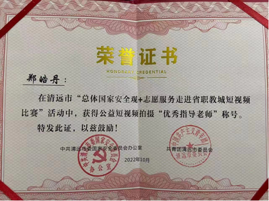 此外,学校大学生新闻中心拍摄的宣传作品,获清远市“总体国家安全观+志愿服务,走进省职教城短视频比赛”公益短视频优秀奖,郑皓丹老师获“优秀指导老师”。
