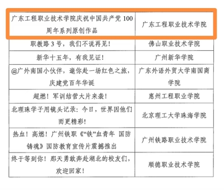 近日,广东省委教育工委公布了2021年度高校宣传思想工作优秀作品评选结果,我校参选作品《广东工程职业技术学院庆祝中国共产党100周年系列原创作品》获优秀新媒体作品三等奖。