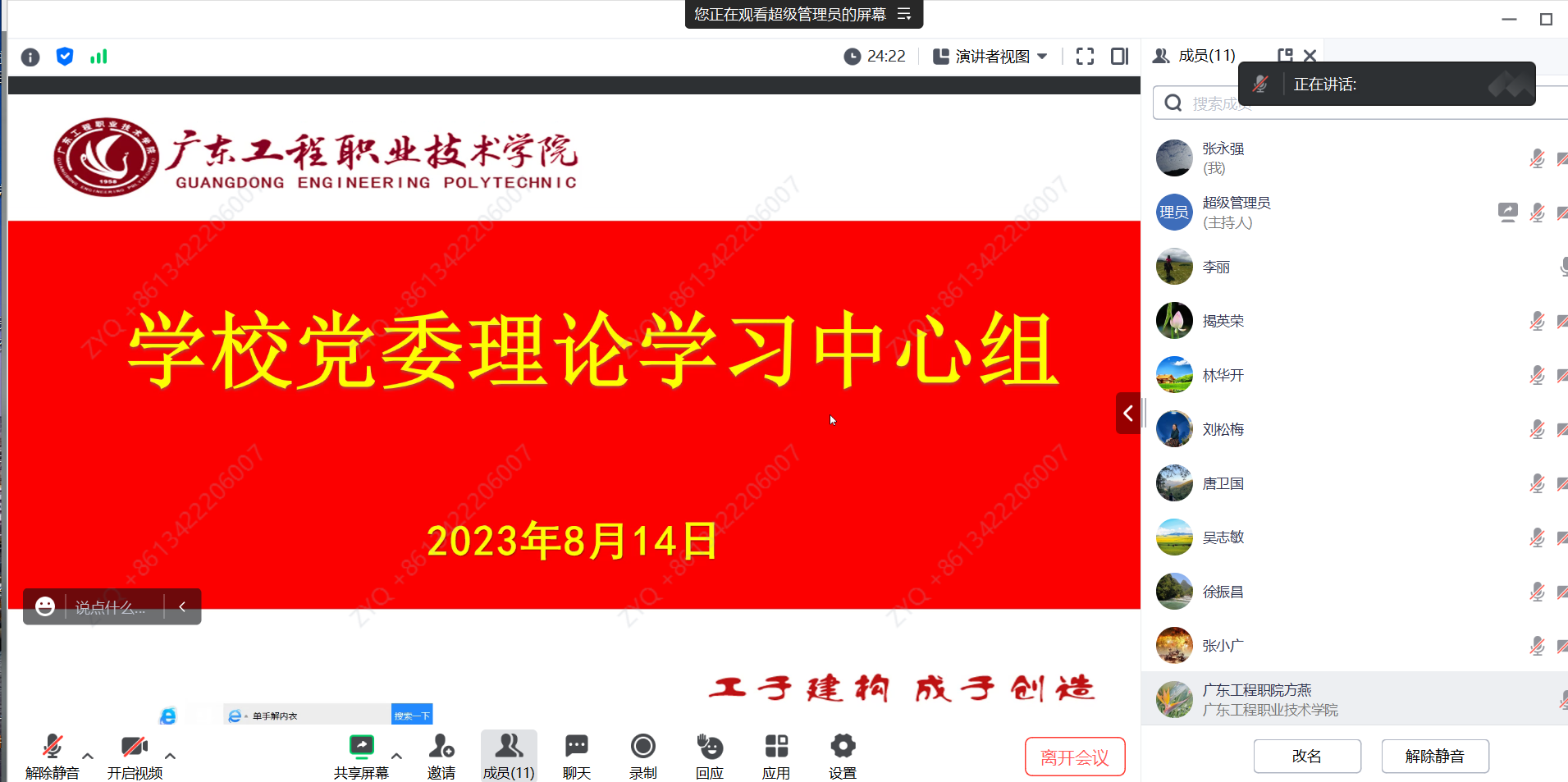 李丽校长要求,要学习领会好、贯彻落实好习近平总书记关于党的建设的重要思想,以高质量党的建设推进学校事业高质量发展。要坚持不懈用习近平新时代中国特色社会主义思想凝心铸魂,深入开展学习贯彻习近平新时代中国特色社会主义思想主题教育,推动党员、干部在以学铸魂、以学增智、以学正风、以学促干上下功夫见实效。要坚持党管干部原则,认真落实新时代好干部标准,为学校的事业发展打造高素质干部队伍。要落实好科教兴国战略、人才强国战略,将人才强校与支持粤港澳大湾区结合起来。要增强党组织政治功能和组织功能,提升党组织的组织力、战斗力,发挥党员在“双高”校建设、教书育人、管理服务中的先锋模范作用,为学校事业的高质量发展提供思想保证、政治保证、组织保证。