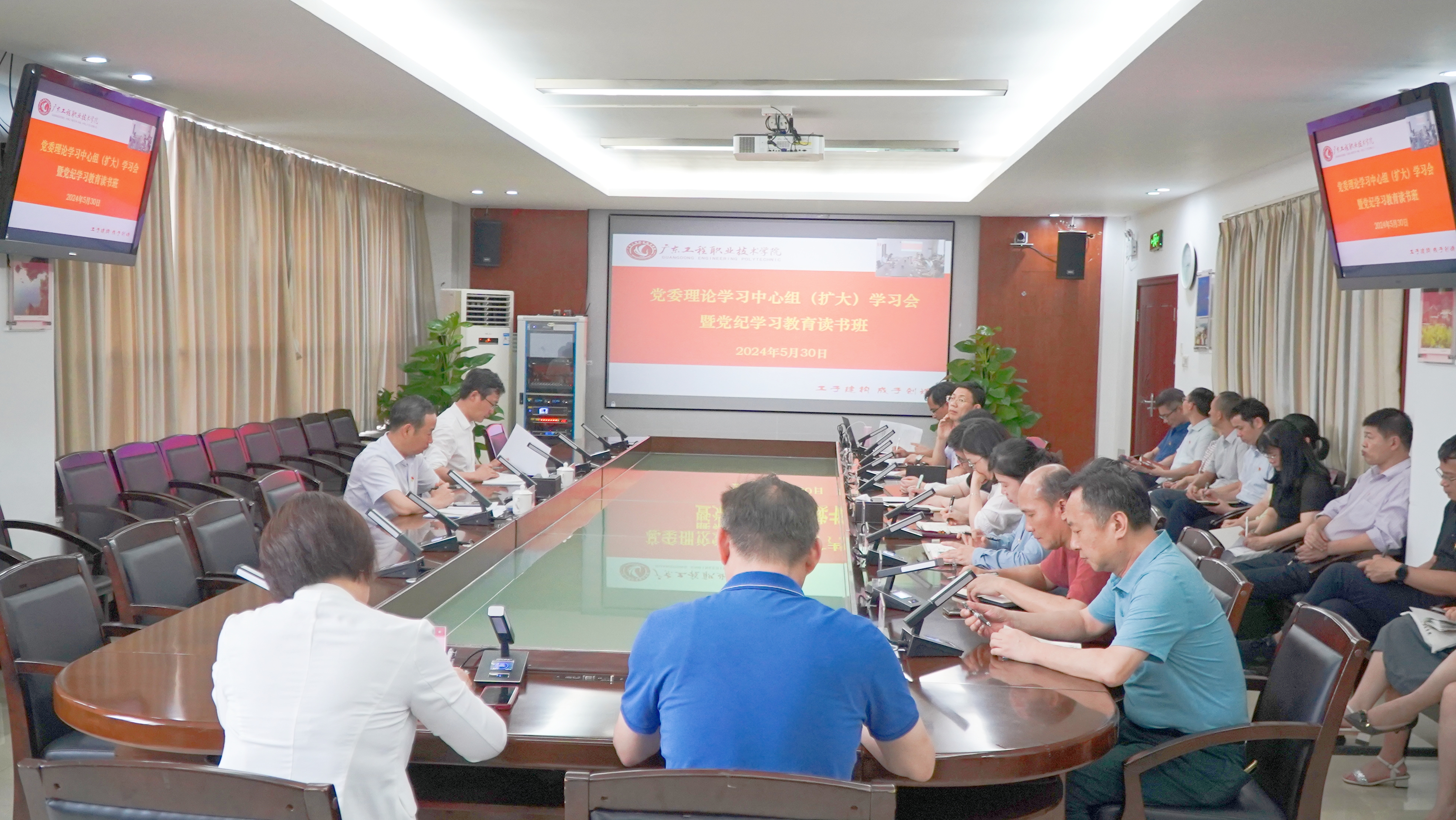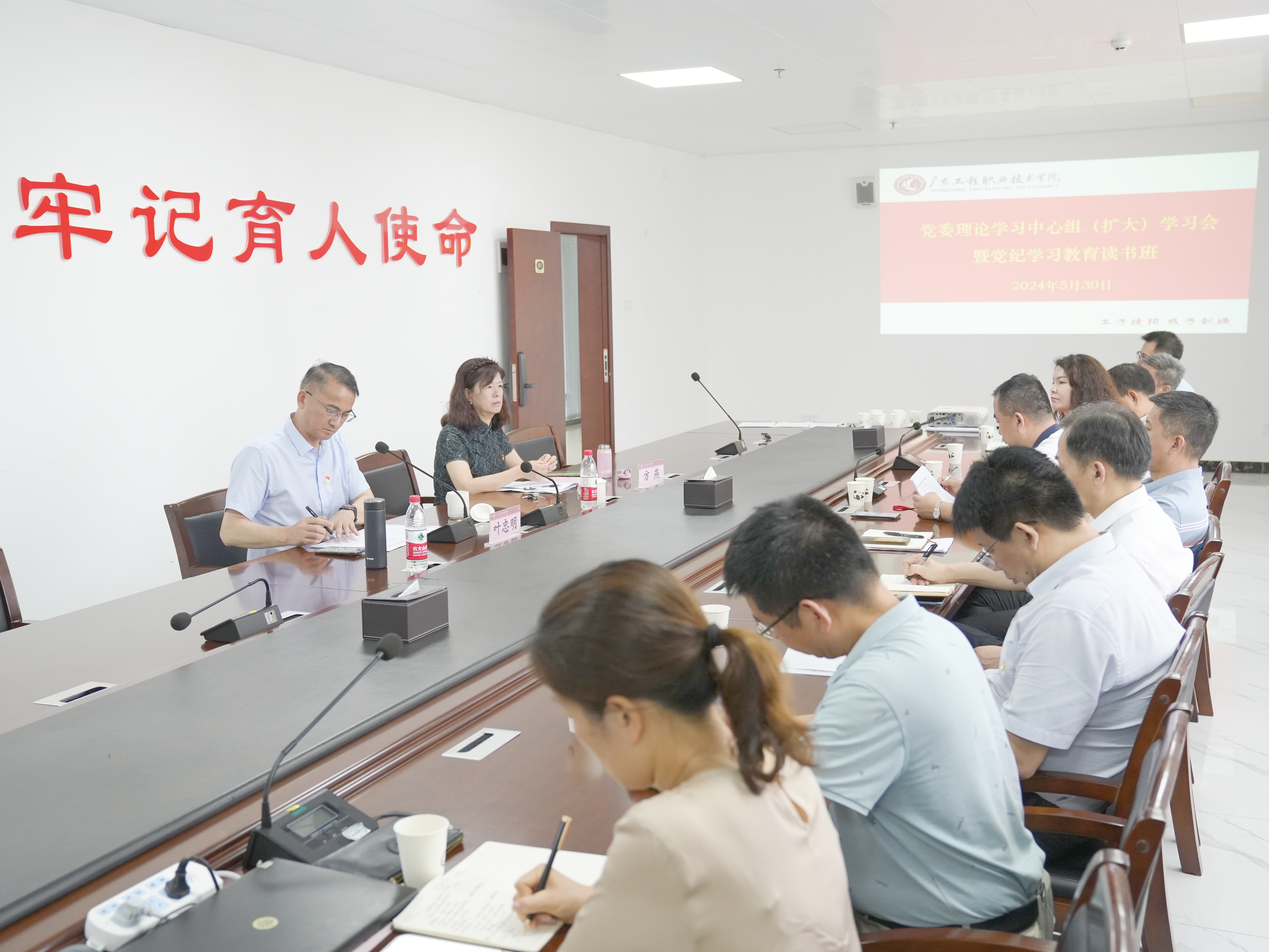 5月30日下午,学校举行党委理论学习中心组(扩大)学习会暨党纪学习教育读书班,专题学习了习近平总书记关于党的自我革命的重要思想和《论党的自我革命》,以自我革命引领学校事业高质量发展。学校党委书记叶忠明主持了学习会,学校党委副书记方燕,党委委员、副校长张小广进行了领学发言,学生工作部(招生与就业指导中心)部长黄馥丽、图书馆馆长邓中云作了学习发言。在校的党委委员、中层干部参加了会议,会议采用视频连线方式在广州校区和省职教城校区同步举行。