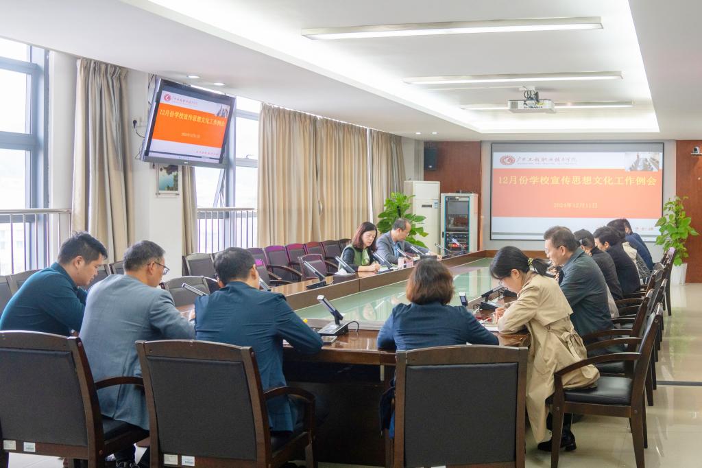 12月11日上午,学校通过视频连线方式在广州校区和省职教城校区召开宣传思想文化工作例会。学校党委方燕副书记,党政办公室、组织统战部、学生工作部、人力资源部、教务部、科学技术部、财务部、总务后勤部(保卫部)、国际教育学院、继续教育学院、图书馆、现代教育技术中心、团委等部门负责人,各二级学院党委书记,宣传部(武装部)全体人员参加会议,宣传部(武装部)副部长林华开主持会议。