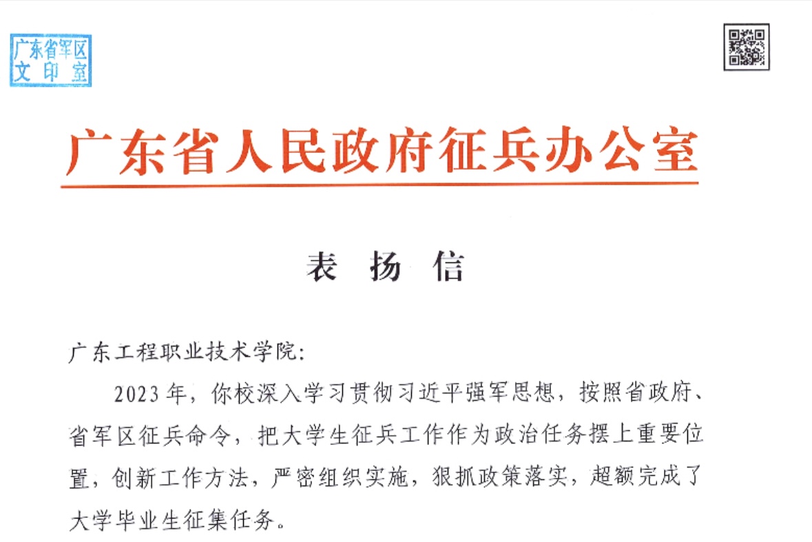 近日,学校收到省教育厅和省人民政府征兵办公室发来的表扬信,对我校征兵工作给予了高度肯定。信中写道:你校深入贯彻习近平强军思想,按照省政府、省军区征兵命令,把大学生征兵工作作为政治任务摆上重要位置,创新工作方法,严密组织实施,狠抓政策落实,超额完成了大学毕业生征集任务。