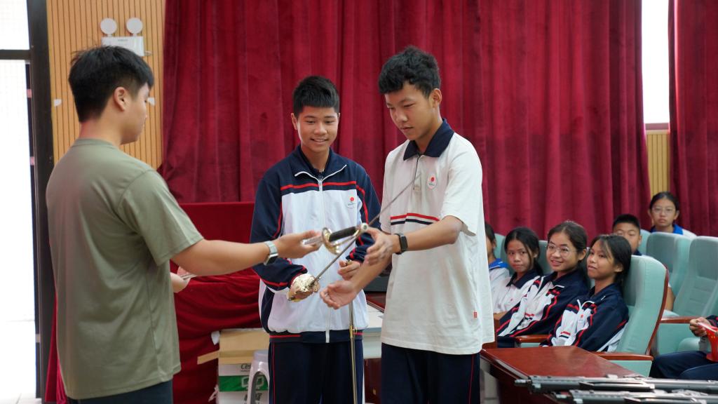 报告厅内整齐摆放了各种模型有礼宾枪、95突击步枪、指挥刀及全套礼服,队员们并逐一进行专业讲解。在互动环节,现场学生积极举手提问,队员们详细介绍军事装备的名称、功能,还分享装备背后的荣誉故事,让孩子们明白,这些装备不仅是维护和平的“武器”,更是国家实力与军人使命的象征。