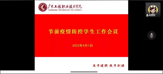 为贯彻落实广东省疫情防控要求和学校党委理论学习中心组(扩大)专题学习会的会议精神,根据学校清明节放假统一部署,2022 年 4 月 1 日上午,学生工作部组织召开“节前疫情防控学生工作会议”。会议由学生工作部部长黄馥丽主持,各二级学院党总支副书记、学生工作部成员参加会议。