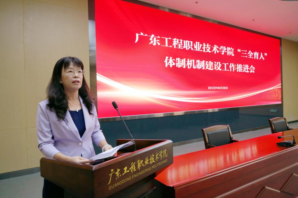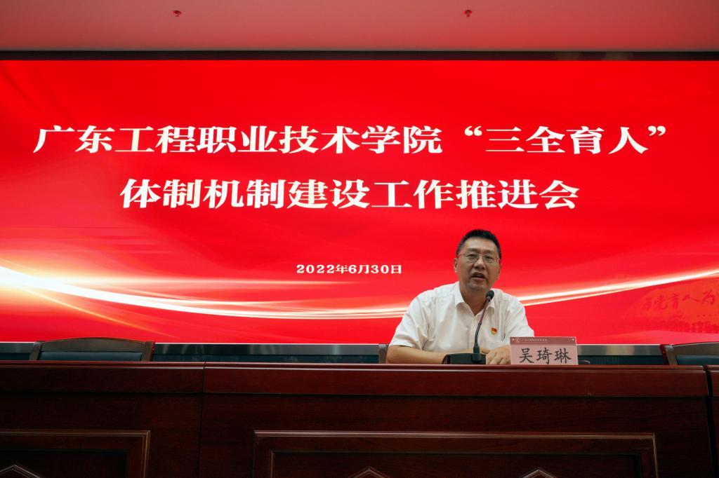推进“三全育人”体制机制建设,是学校学习贯彻习近平新时代中国特色社会主义思想,推动全国教育大会精神和全国高校思想政治工作会议精神、学校思想政治理论课教师座谈会精神落地生根的重要举措,是加强和改进学校思想政治工作的重要部署。全校上下要切实提高政治站位,把“三全育人”作为学校育人工作的总抓手,作为学校综合改革的重要组成部分,作为人才培养的重要内容,加强“三全育人”体制机制建设,形成“三全育人”工作的强大合力。打造具有广东工程特色的“三全育人”工作体系,助力学校“双高”建设,推进学校高质量发展,以优异成绩迎接党的二十大的胜利召开。