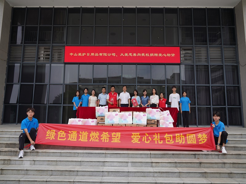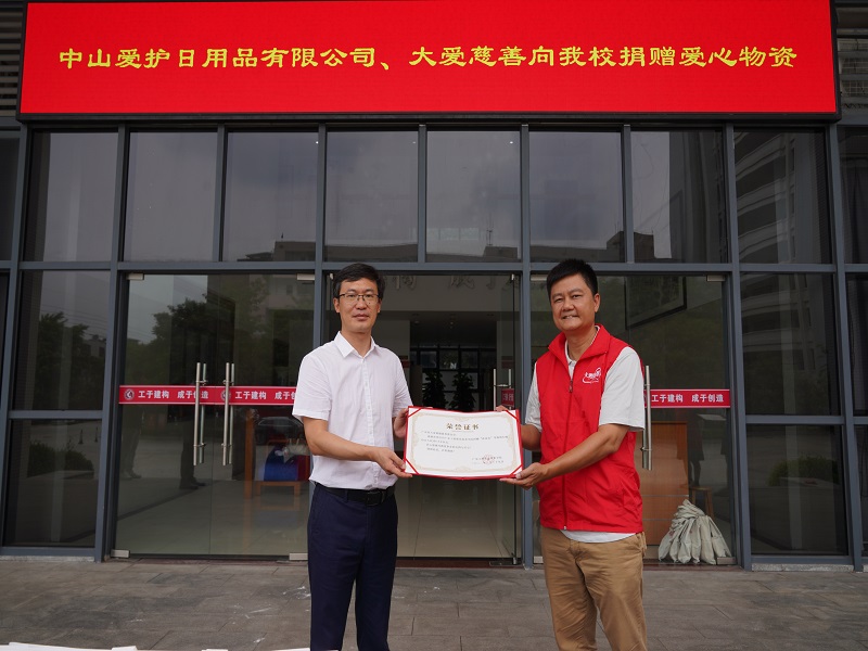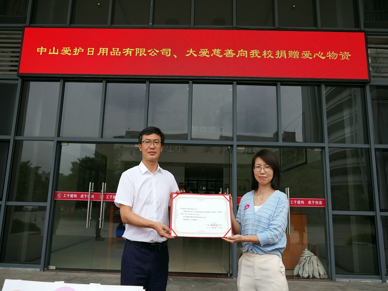8月29日上午,在新学期开学之际,中山市爱护日用品有限公司携手广东省大爱相髓慈善基金会走进我校开展爱心捐赠活动。学校党委委员、副校长张小广代表学校接受爱心捐赠物资,并向爱心企业颁发荣誉证书,以感谢爱心企业对我校的支持,对学生的关爱!捐赠仪式在广州校区办公楼一楼举行,广东省大爱相髓慈善基金会副董事长黄敬廉、中山爱护日用品有限公司市场营销品牌部部长吴容菲、市场营销品牌部媒介策划经理邱雯悦参加捐赠仪式。