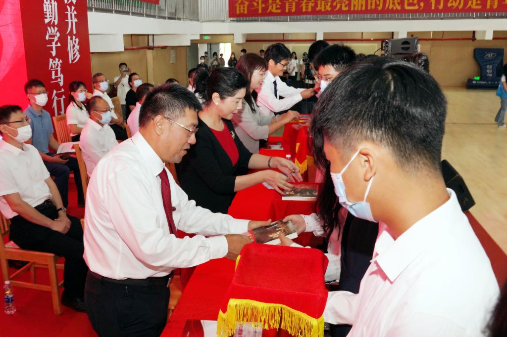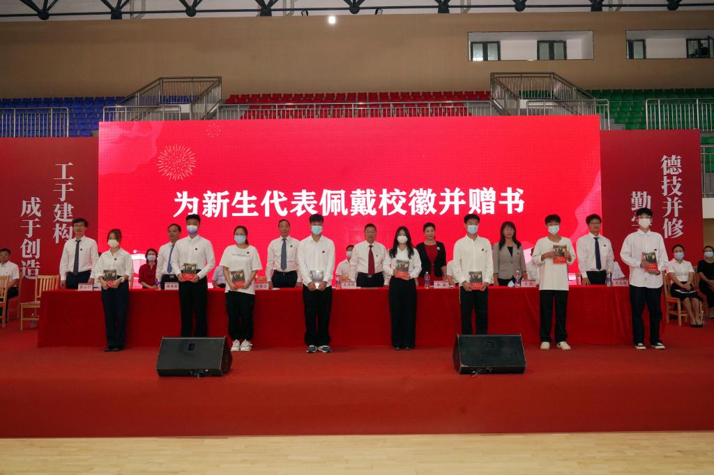 全体学校领导为新生代表佩戴校徽,赠送《习近平与大学生朋友们》一书。鼓励新生牢记习近平总书记对大学生的殷切嘱托,争当理想远大信念坚定的模范,刻苦学习锐意进取的典范,脚踏实地、实干担当,不断培养和提升学习力、思想力和行动力。
