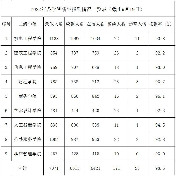 截止9月19日,我校2022级新生报6615人(包括因疫情影响暂缓报到171人,参军入伍23人),报到率93.5%,再创历史新高。新生报到率的提高,彰显了学校雄厚的办学实力,标志着学校影响力和社会认可度的进一步提升。这一成绩的获得,得益于学校领导的高度重视,也离不开二级学院迎新工作人员和学生志愿者热情周到、细致高效的服务以及各职能部门之间相互配合,团结协助。