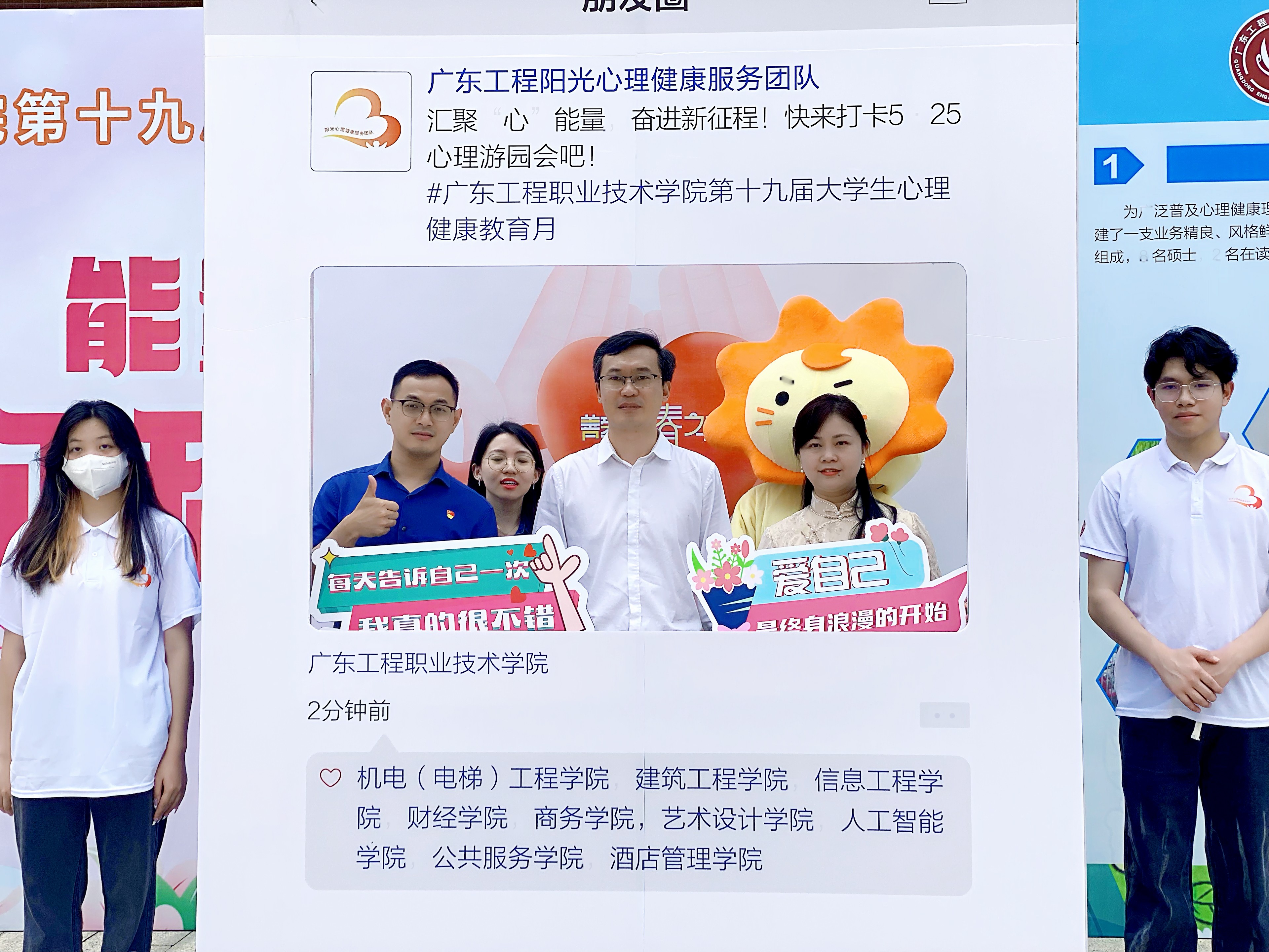心理健康教育是提升学生素质的重要组成部分,学校“5·25 大学生心理健康月”系列活动紧紧围绕“三全育人”工作,积极响应广东省教育厅的号召,一方面充分利用微信公众号、大型展板等宣传渠道,广泛开展学生心理健康知识和预防心理问题科普教育,生动展示我校广大学子积极、阳光、向上的精神面貌,全面展现新时代中国青年应有的精气神;另一方面,心理健康师生团队凝心聚力,全面提升,深入学生群体,举办喜闻乐见的各项心理健康系列活动,搭建了学校与学生、学生之间心灵沟通的桥梁,增强了学生的心理幸福感,提升了我校心理育人效果,丰富了学生们的校园文化生活,营造了有利于学生健康成长成才的环境和氛围。