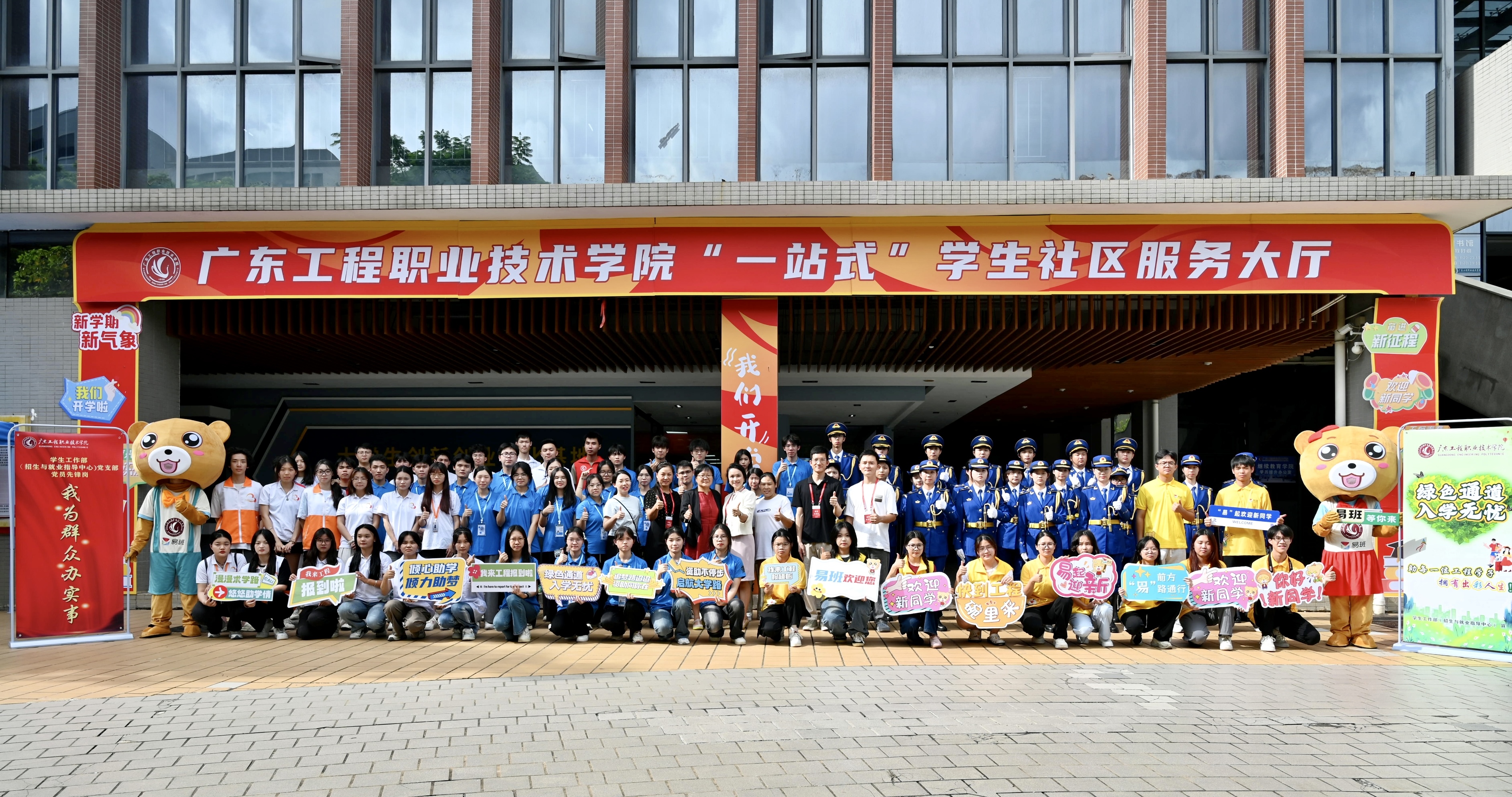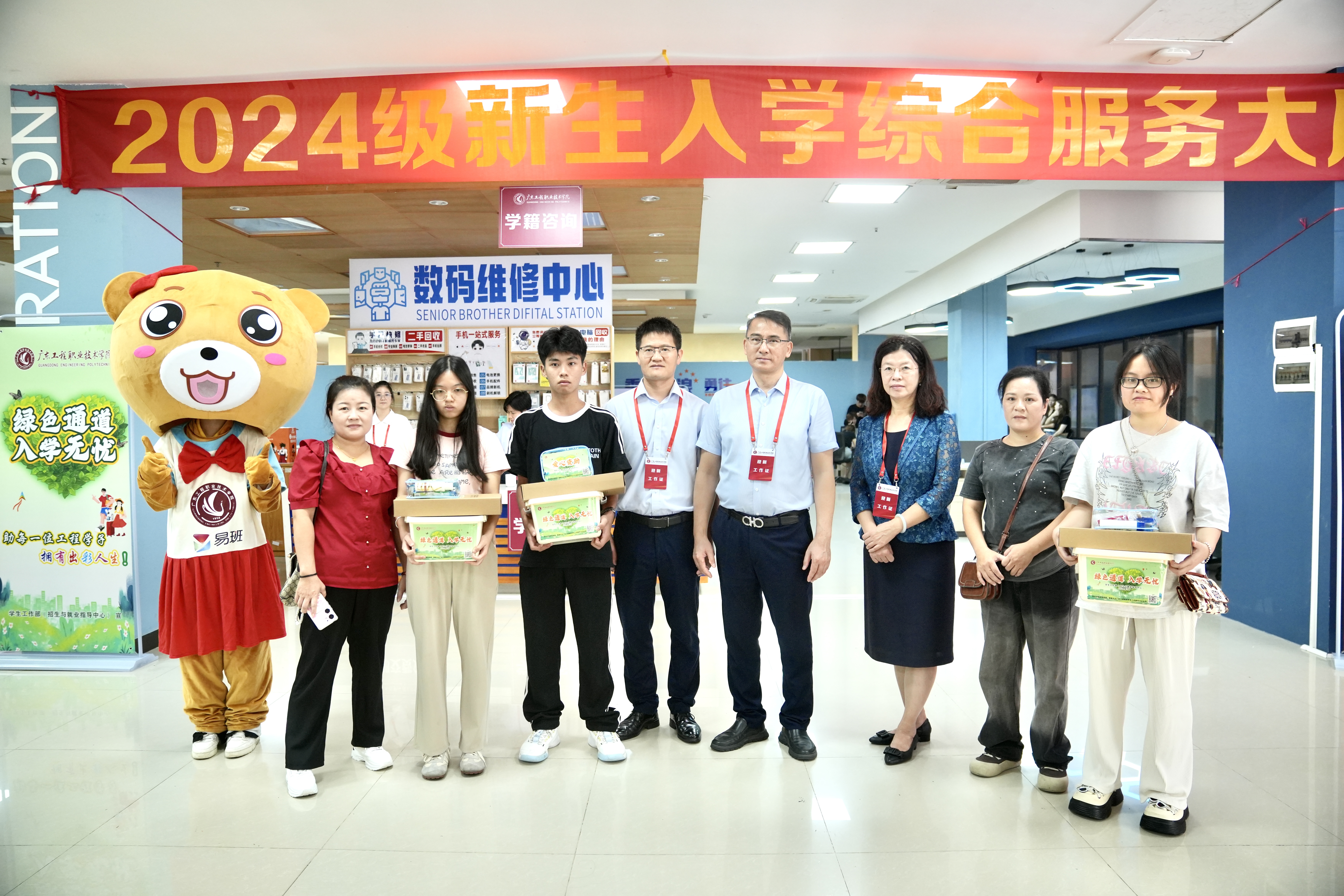 党员先锋讲奉献。聚焦迎新现场,党员先锋们化身“新生向导”,携手职能部门在 “一式”学生社区服务大厅,现场为新生及家长解决各类问题。大厅内,开设资助政策、勤工助学业务办理咨询窗口,宣传部(武装部)积极宣传退伍政策,教务部设立学籍咨询窗口,财务部设置便捷的学费缴纳点,为新生提供全方位的入学学习生活保障。同时,对于有残障的学生,学校也提前进行了周到的安排,提供了暖心服务,确保他们全程无忧。学校易班发展中心吉祥物“易班熊”与新生及家长合影留念,留下了美好的瞬间。这些举措不仅传递了学校的温暖与关怀,也彰显了学校以人文关怀为核心的教育理念和社会责任感。