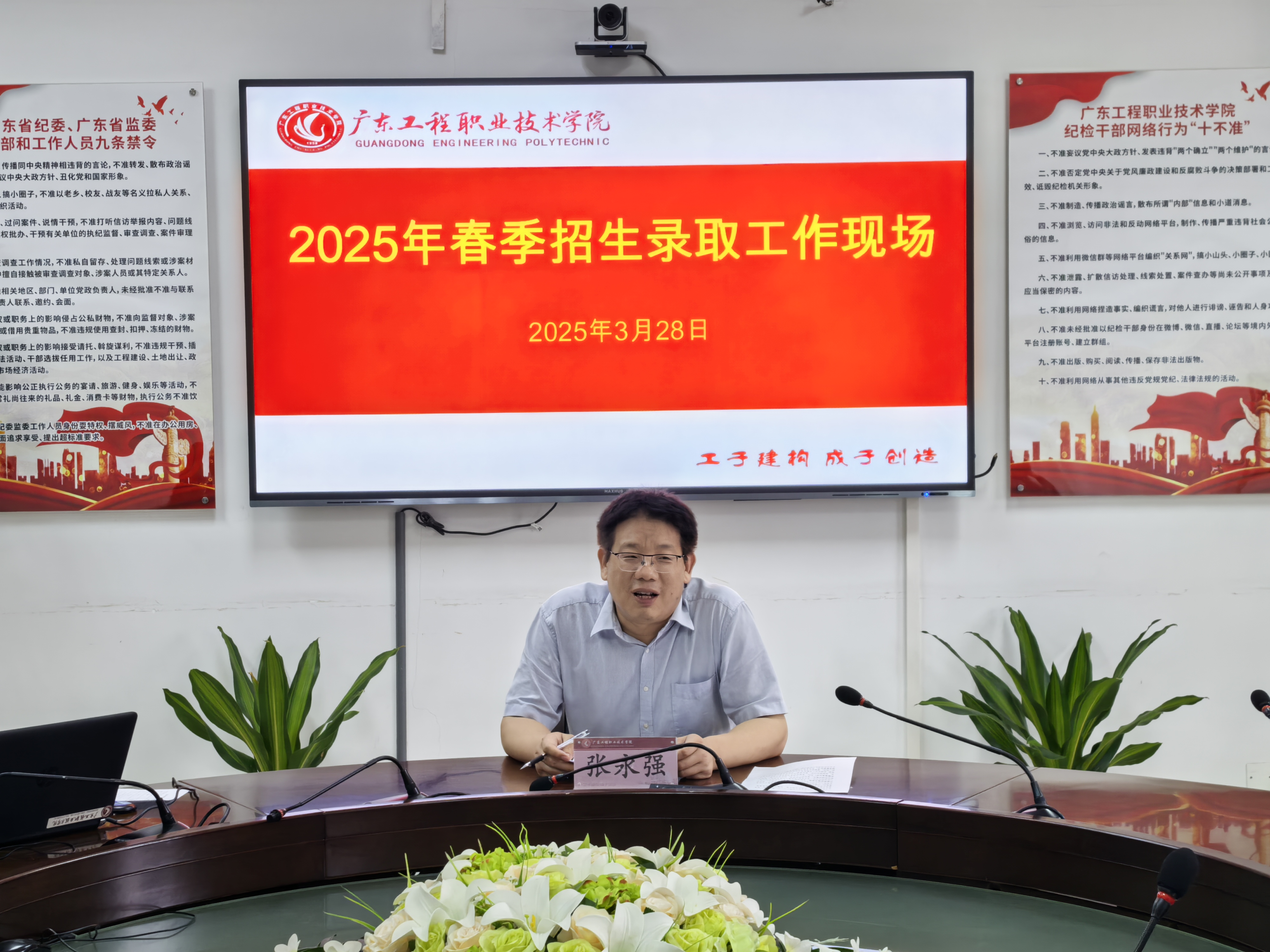 2025年3月28日下午,我校2025年春季招生录取工作会议在办公楼406会议室召开,副校长张永强、学生工作部(招生与就业指导中心)、各二级学院院长、纪检室相关工作人员参加会议。