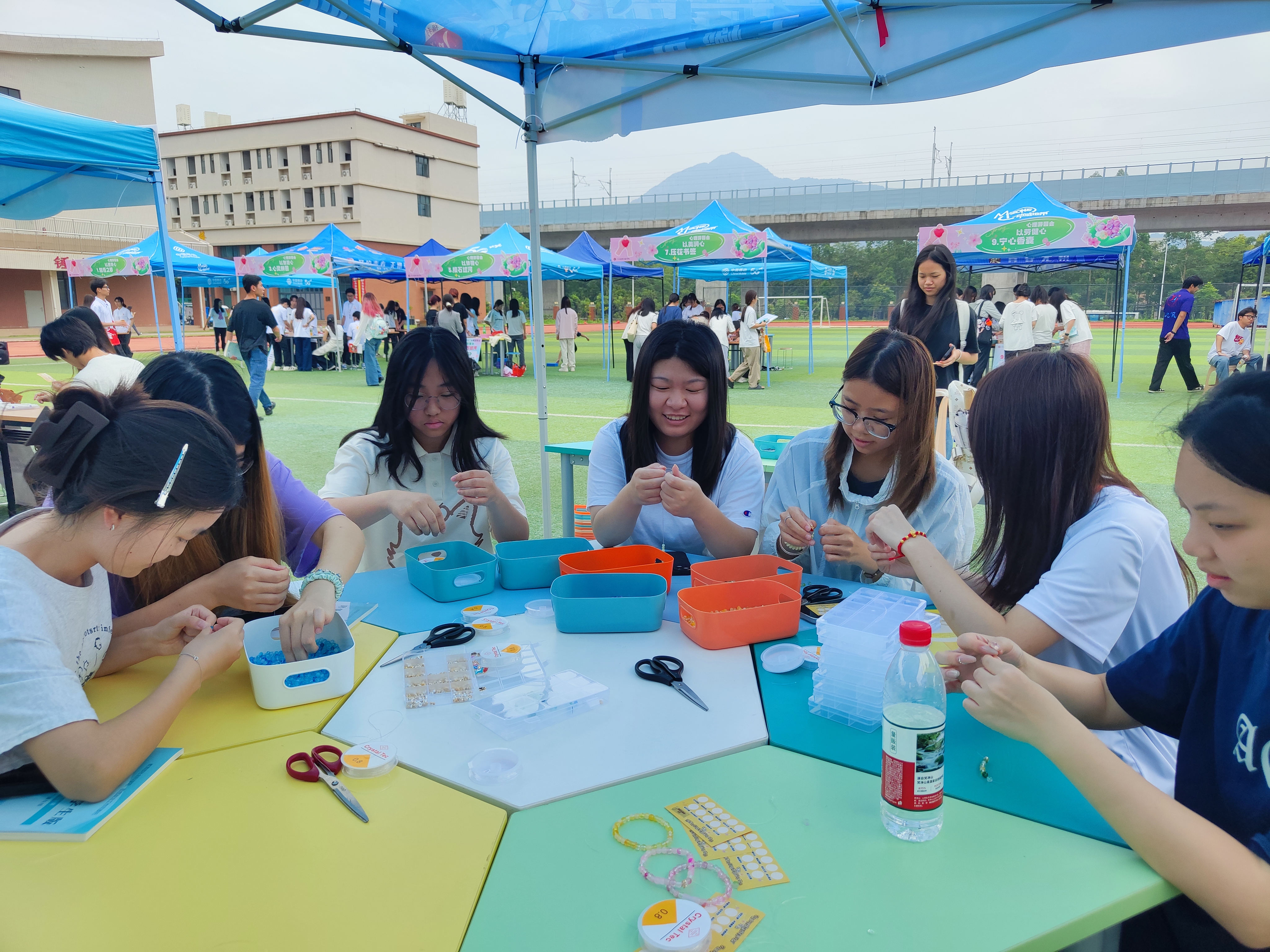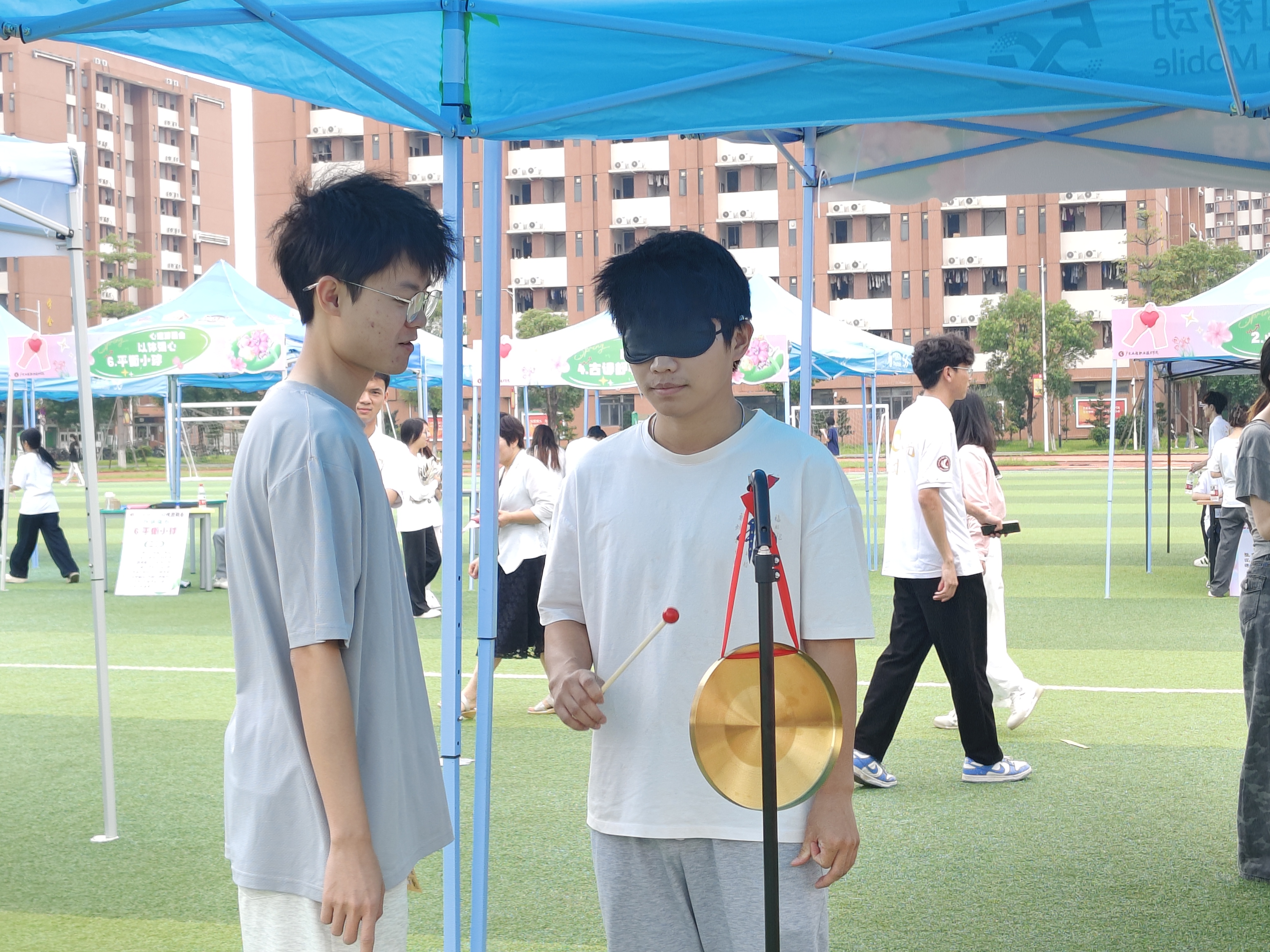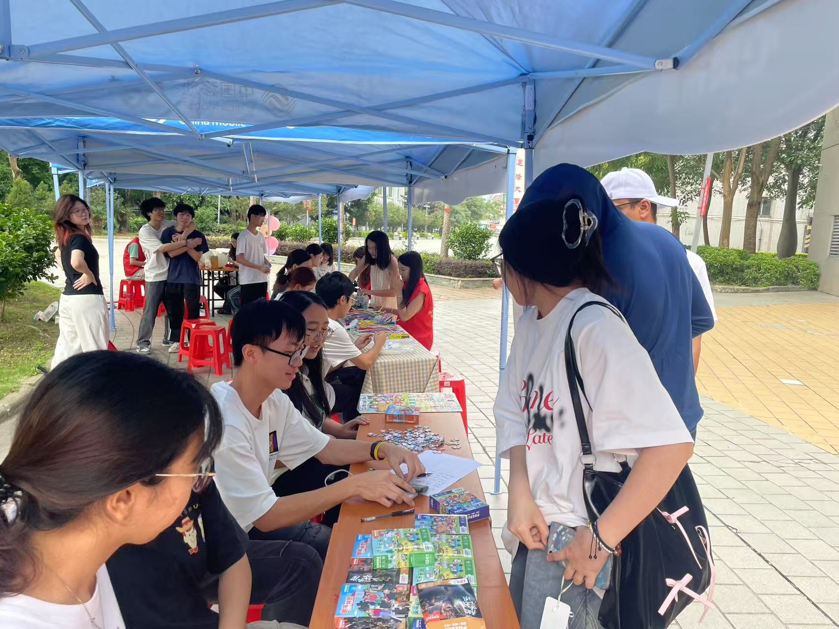 启动仪式后,丰富多彩的心理游园活动正式展开。游园活动以“以德育心、以智慧心、以体强心、以美润心、以劳健心”为脉络,设计了12项兼具趣味性与教育意义的游戏,覆盖清远、广州两校区,吸引超过一千余名师生参与。在“信任之锣”游戏中,搭档间通过蒙眼协作与限定指令沟通,在击锣的清脆声响中感受“被信任”与“责任感”的双向流动;“心笺叠语”摊位前,匿名烦恼与暖心建议的交换,让参与者在文字共鸣中释放压力,收获共情的力量;“心灵拼图”现场,三人小组通过心理知识问答与合作拼图,在思维碰撞中增强团队凝聚力,领悟“个体价值在集体中的融合”。手工体验类项目同样人气高涨。“压花书签”制作中,干花定格的不仅是自然之美,更是“将美好体验转化为心理能量”的正念实践;“曼陀罗画”填色区,参与者在对称构图中梳理情绪,于色彩流动间完成潜意识的自我探索;“宁心香囊”摊位前,师生们亲手调配香料,在中医芳香疗法中感受自然香气对心灵的疗愈,体验“主动掌控心理状态”的成就感。