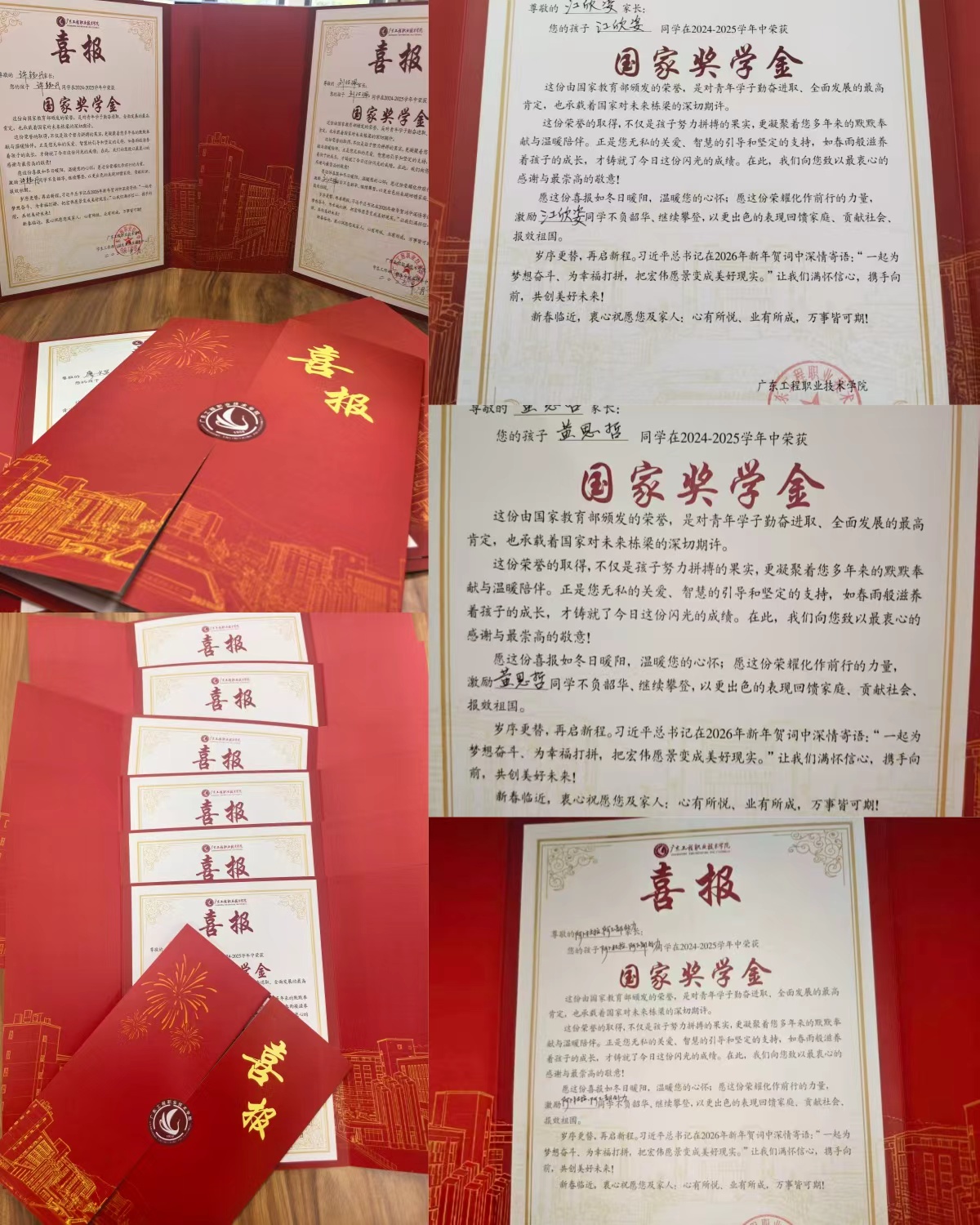 寒假前夕,学校创新开展“红色喜报”精准送达行动,将44名国家奖学金获得者的荣誉喜报送至学生家中。一方喜报,承载的不仅是学生的优异成就,更是学校育人成效的家庭回响。家长们纷纷在朋友圈晒出这份“年度荣光”,字里行间流露出真挚感动与自豪,生动诠释了家校协同育人的温暖力量。
