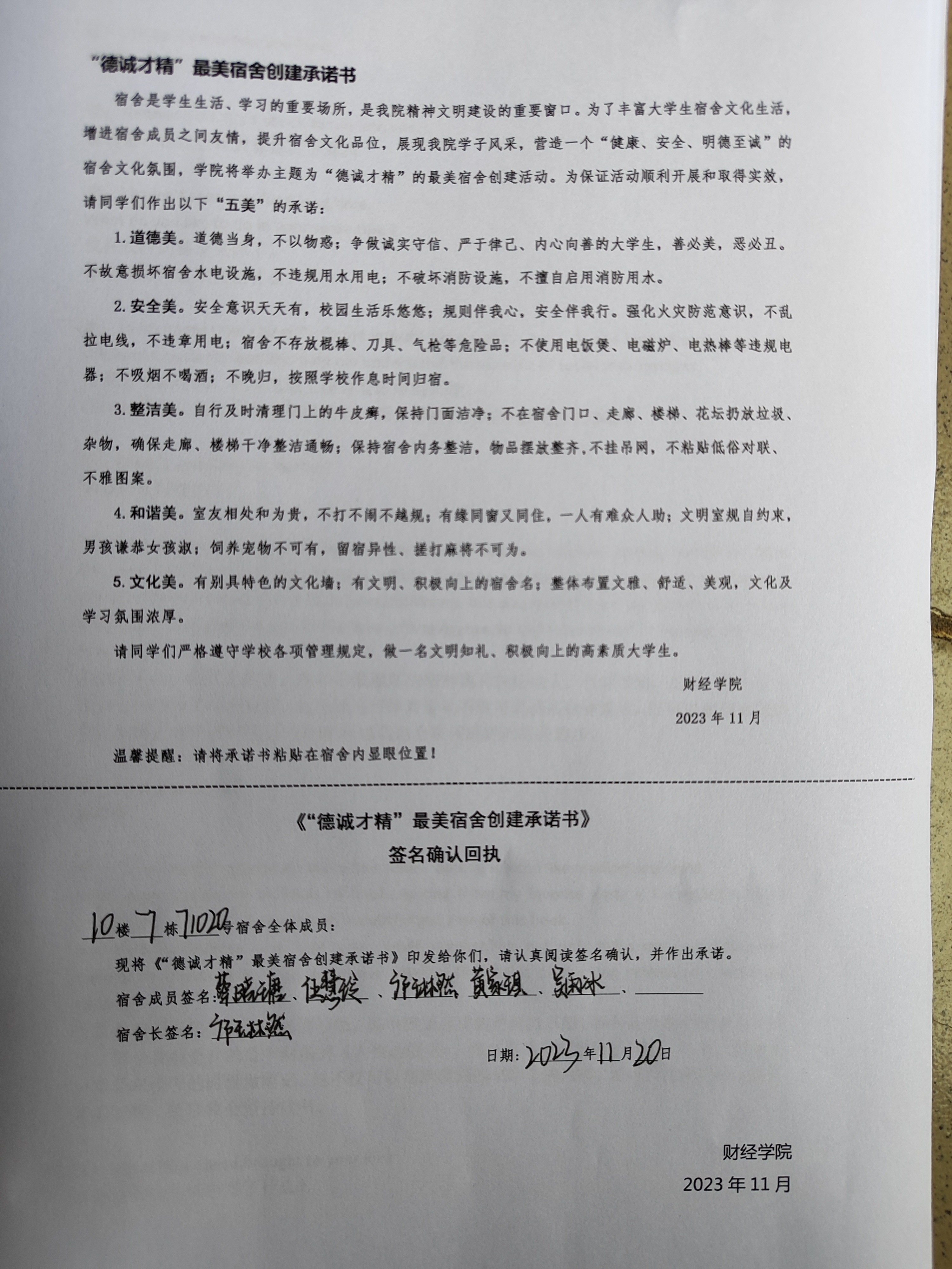 利用各种载体在学生群体中宣传和动员,全方位引导学生积极主动参与最美宿舍评比活动,对宿舍内部进行整理、清洁和装饰,打造一个“五美”宿舍,增强宿舍情感。同时,学院全体辅导员联合学生会权益部有序组织全院宿舍成员签订《“德诚才精”最美宿舍创建承诺书》,开展“德诚才精”最美宿舍启动仪式,学生干部代表带领宿舍长现场作承诺。
