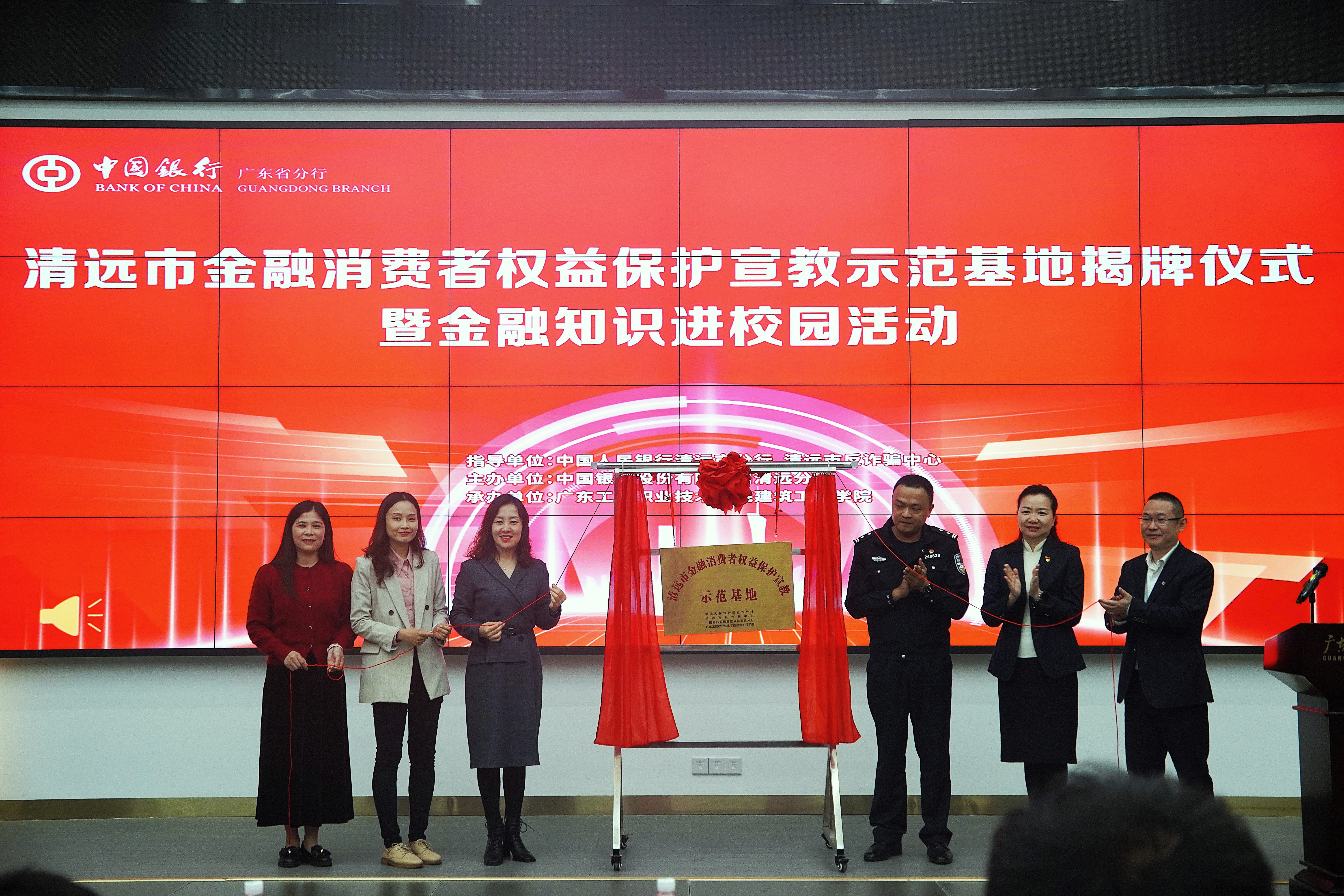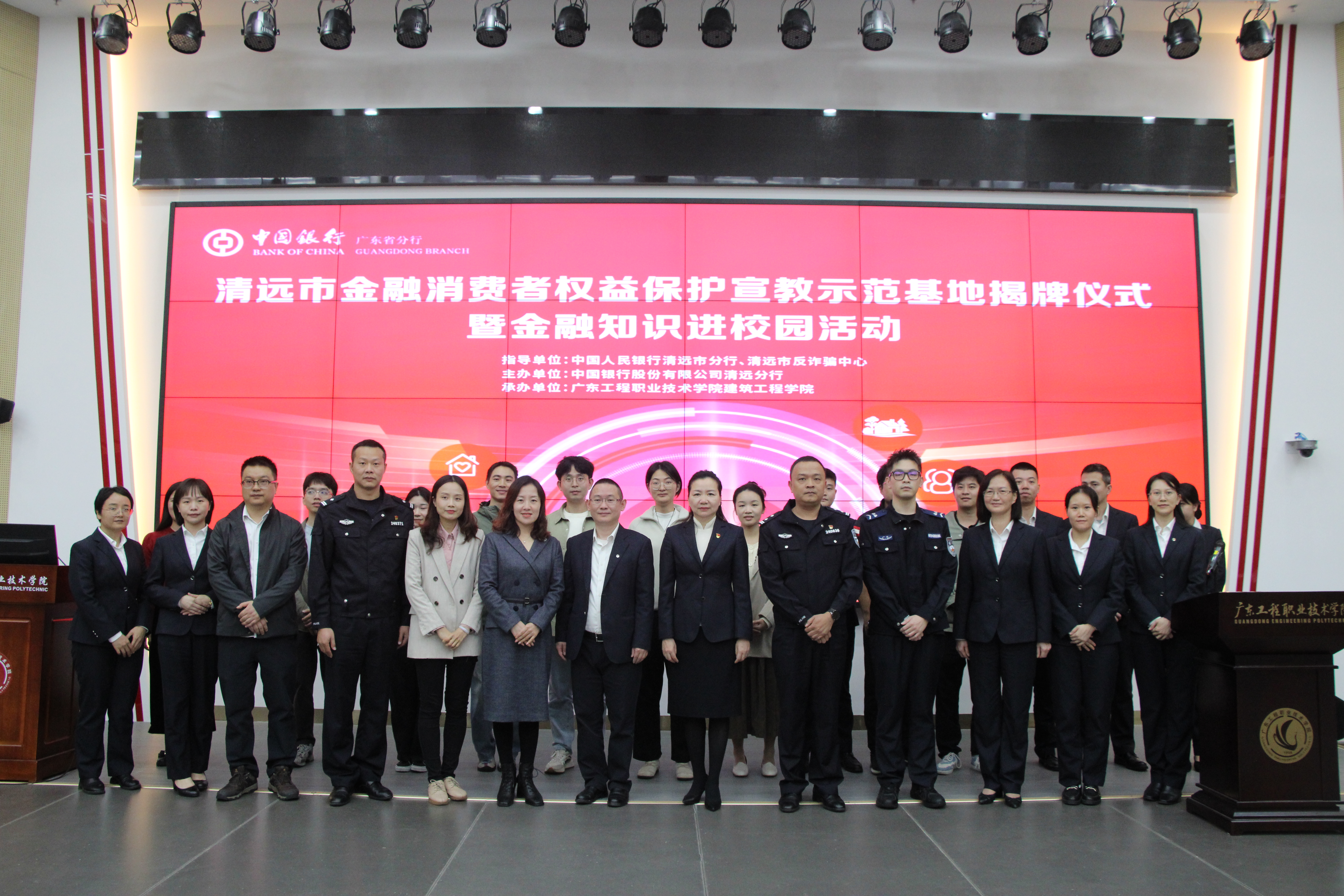 在中国银行广东省分行、中国人民银行清远市分行、清远市反诈骗中心的指导下,建筑工程学院与中国银行清远分行共同建立的清远市首个高校金融消费者权益保护宣教示范基地正式落地。中国银行广东省分行高级经理包海健、中国银行清远分行(简称“清远中行”)副行长钟小兰、建筑工程学院党委书记钟婷、中国人民银行清远市分行科长罗倩文、清远市反诈骗中心副支队长蔡云锋等多名领导出席了2024年11月25日在广东工程职业技术学院Q1-228举行的揭牌仪式,建筑工程学院约200名师生共同见证。