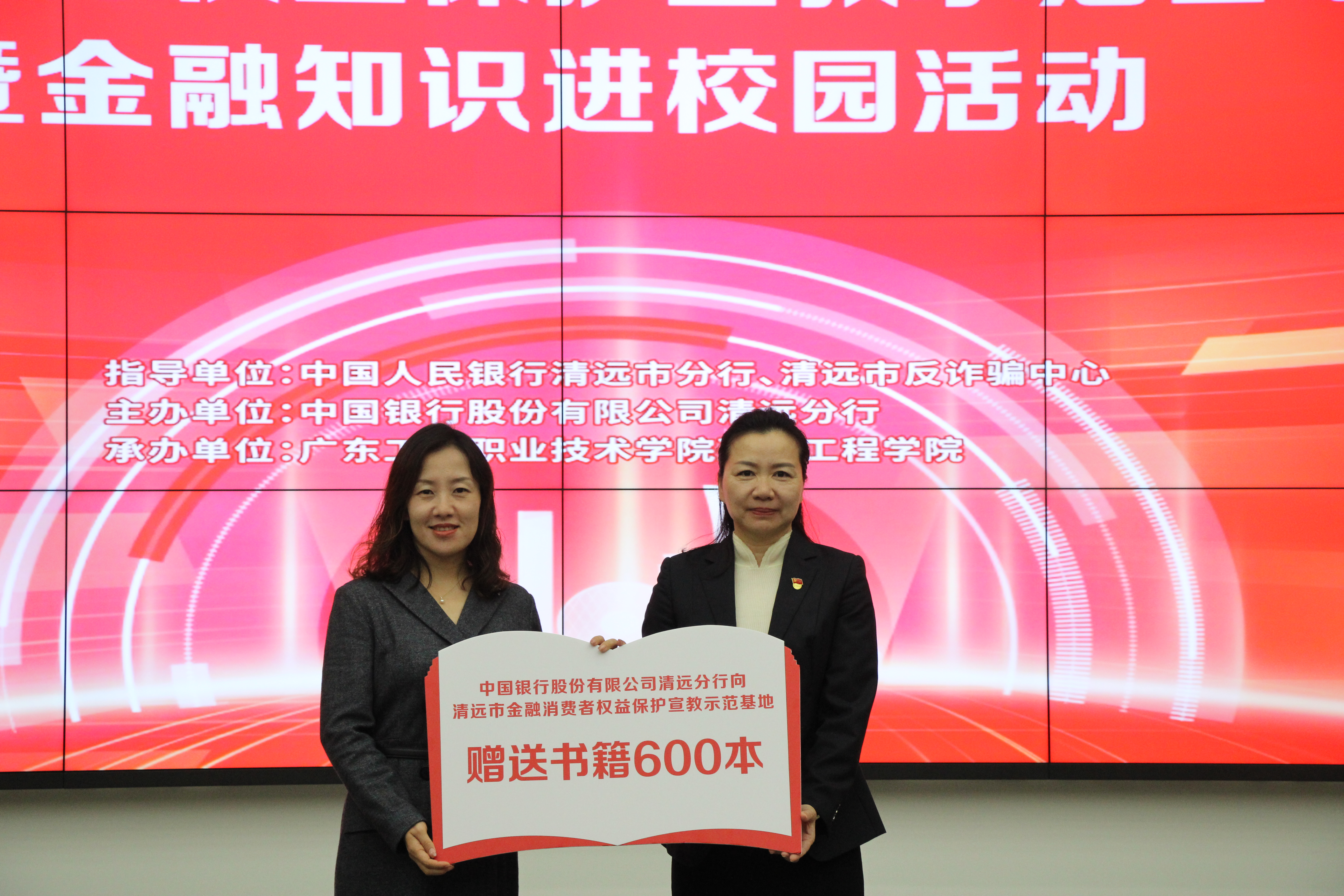 在热烈的掌声中,指导单位和共建单位出席领导嘉宾共同为清远市金融消费者权益保护宣教示范基地揭牌。随着红布的揭开,标志着这一宣教平台正式启用。清远中行向基地赠送书籍600本,涵盖了思想理论、金融知识、消费者权益保护等多方面内容,为学生提供了丰富的学习资源。