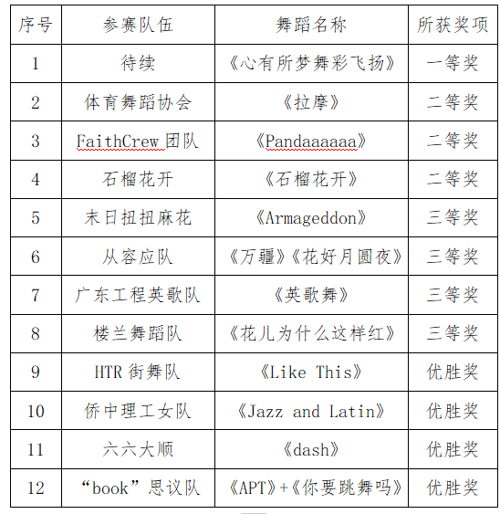 据统计,本届比赛覆盖所有二级学院,共计90余名选手参赛,比赛不限舞种、人数,形式丰富多彩,决赛现场,12 组晋级选手展示了民族舞、英歌舞、街舞、现代舞、啦啦操等多种舞蹈类型,现场激烈角逐,精彩纷呈,在舞动的世界里,选手们用优美的肢体语言,通过肢体舞动的方式向观众们展示自己的舞蹈演绎,活动现场虽寒风阵阵,但在场的观众们感受到青春的热烈与柔美以及梦想的激扬与火热,现场不时响起一阵阵热烈的欢呼声和掌声;活动邀请了学校龙狮队作为开场表演节目以及学校声乐协会的同学担任演唱嘉宾。