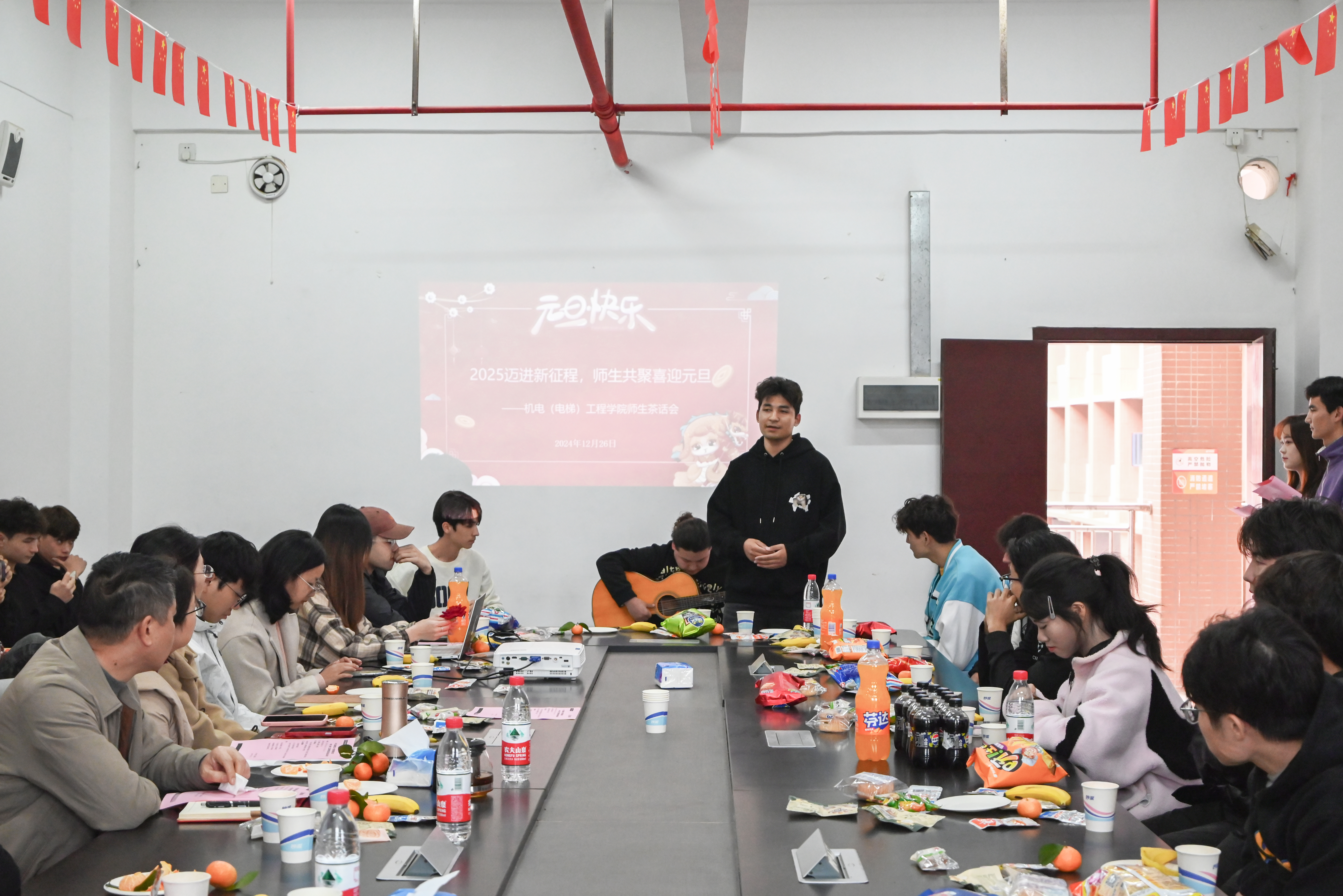 随着岁末的脚步日益临近,即将迎来新的一年。为回顾过去一年的成长与收获,展望未来的学习与工作,增进师生之间的情感与交流,机电(电梯)工程学院于12月26日下午在教学楼2-203举办迎新年师生茶话会。学院党委书记周奇舟、副书记张荣及学院师生代表参加了茶话会,活动由恰力阿提·阿了木和郜璐瑄同学主持。