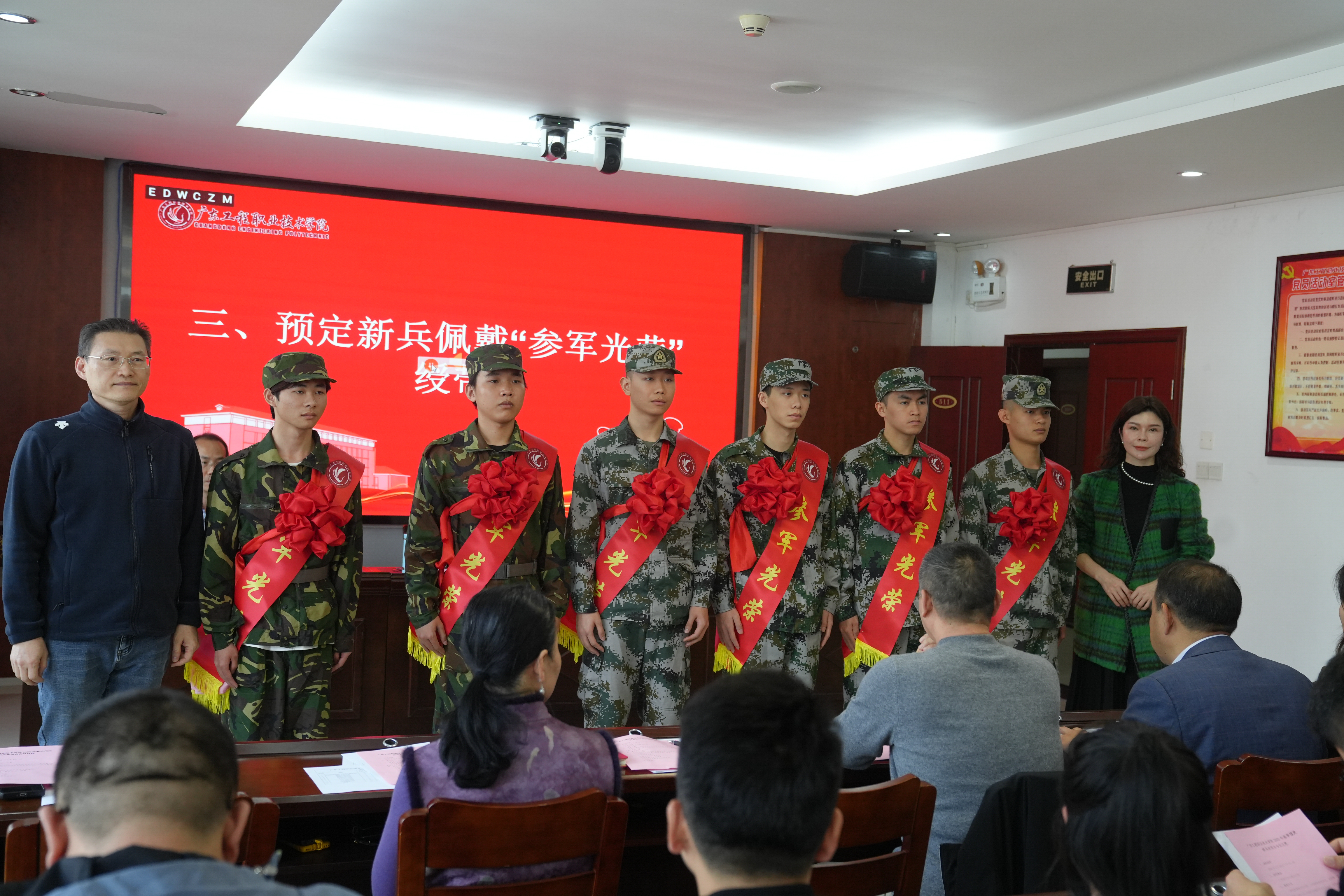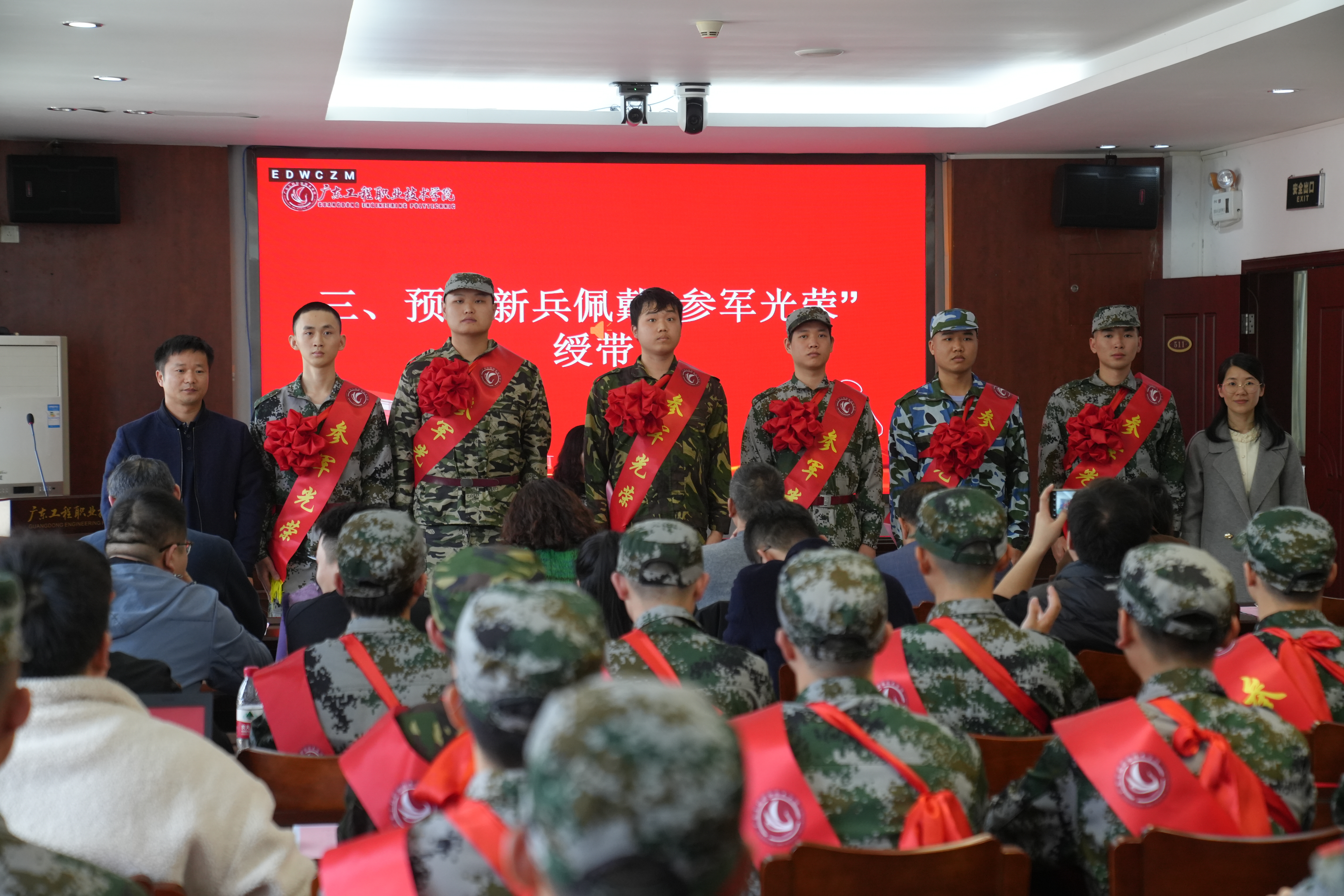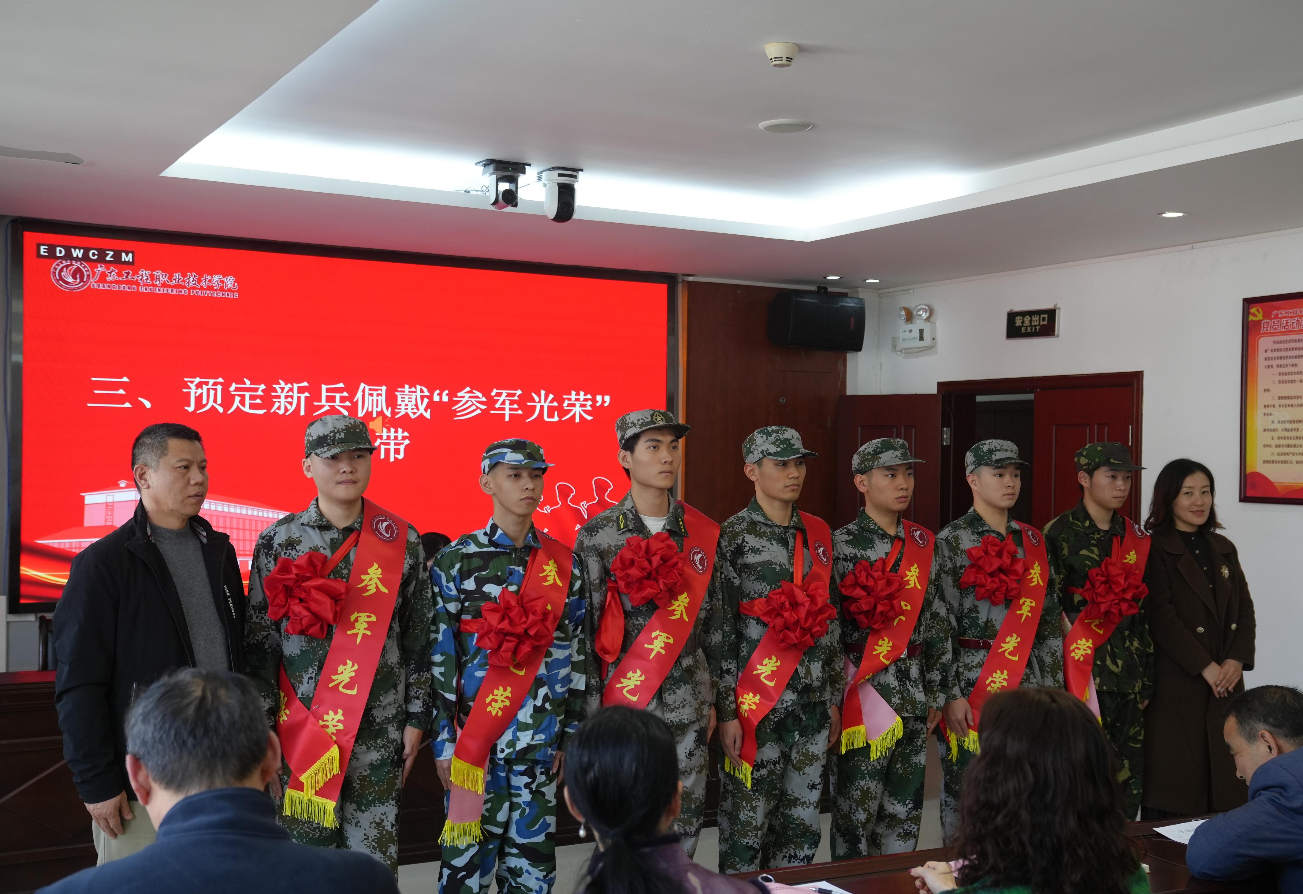 与会领导为新兵们披挂绶带和佩戴大红花,新兵们身姿挺拔、精神抖擞、眼神坚定,纷纷表示要不断提高自身综合素质和军事素养,赤心向党,忠心报国,为国防现代化建设贡献自己的力量,为广东工程增光添彩。