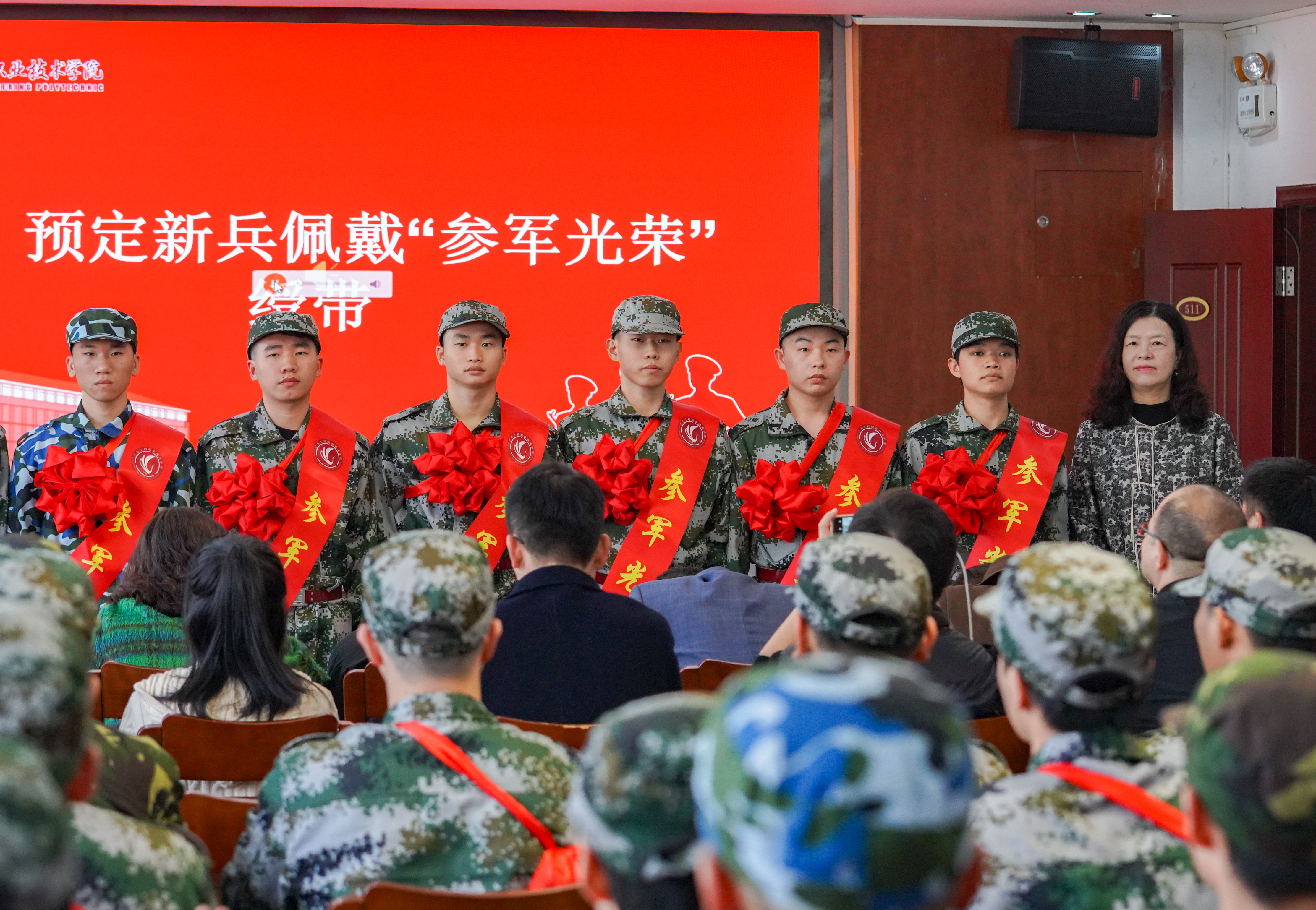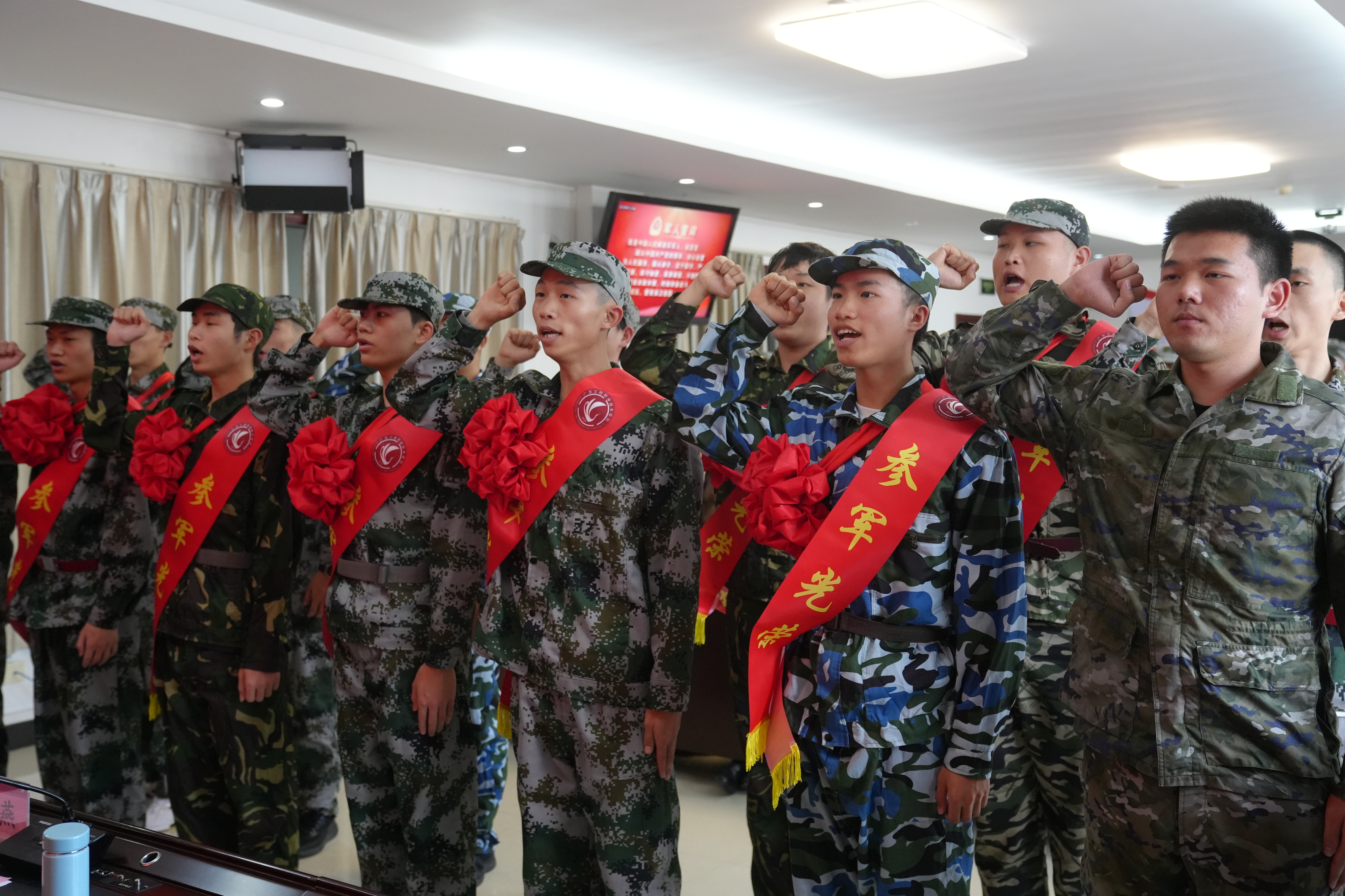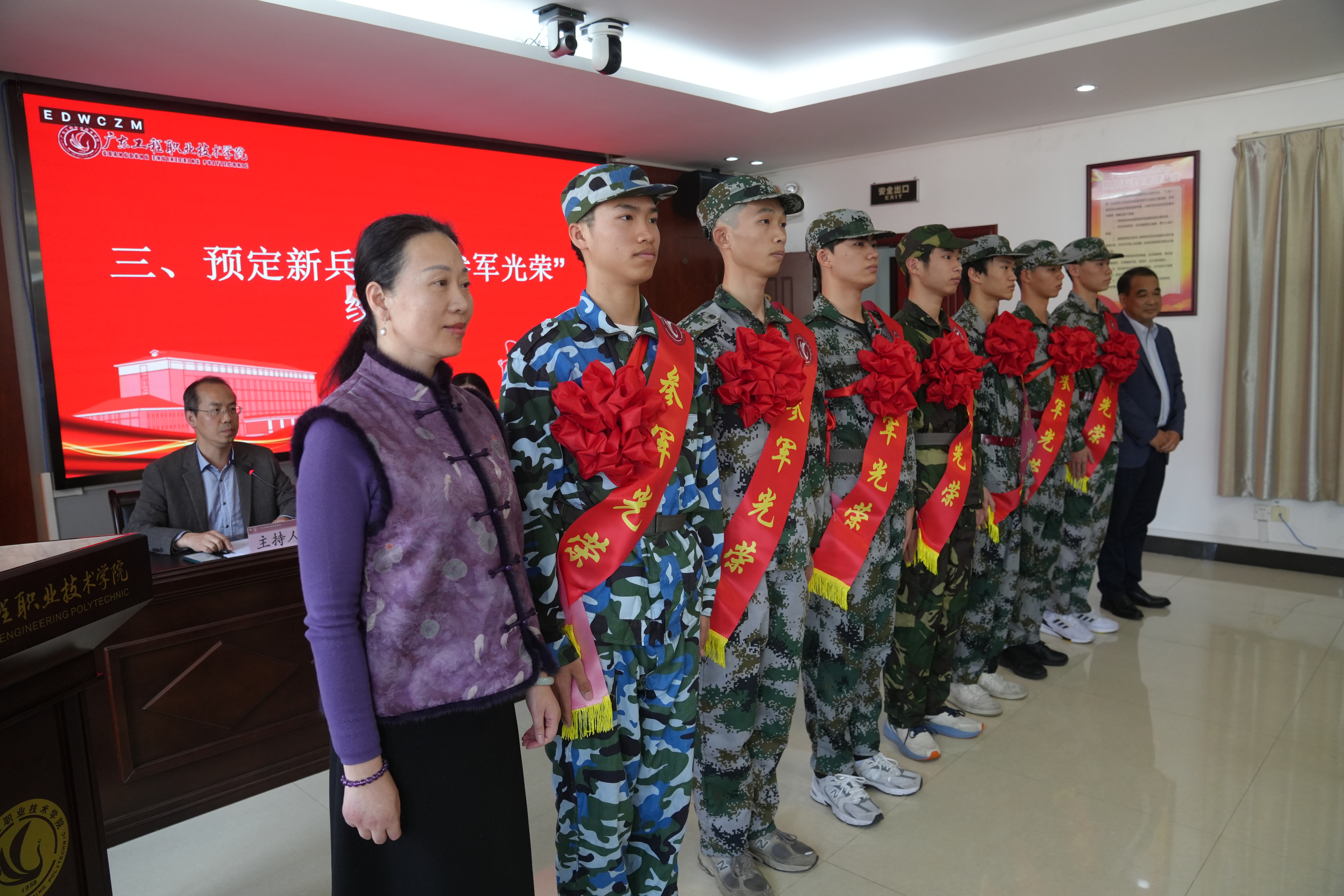与会领导为新兵们披挂绶带和佩戴大红花,新兵们身姿挺拔、精神抖擞、眼神坚定,纷纷表示要不断提高自身综合素质和军事素养,赤心向党,忠心报国,为国防现代化建设贡献自己的力量,为广东工程增光添彩。