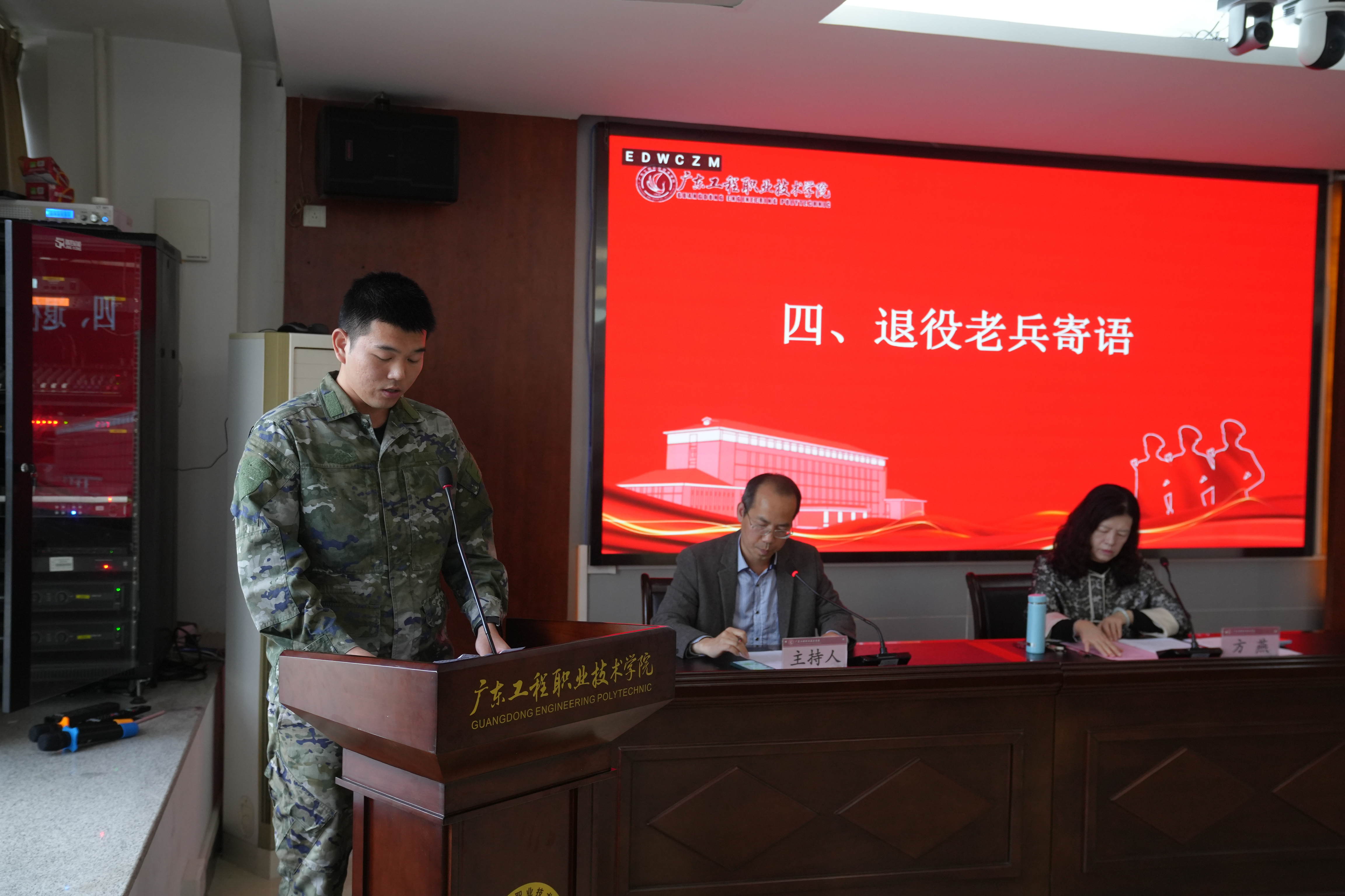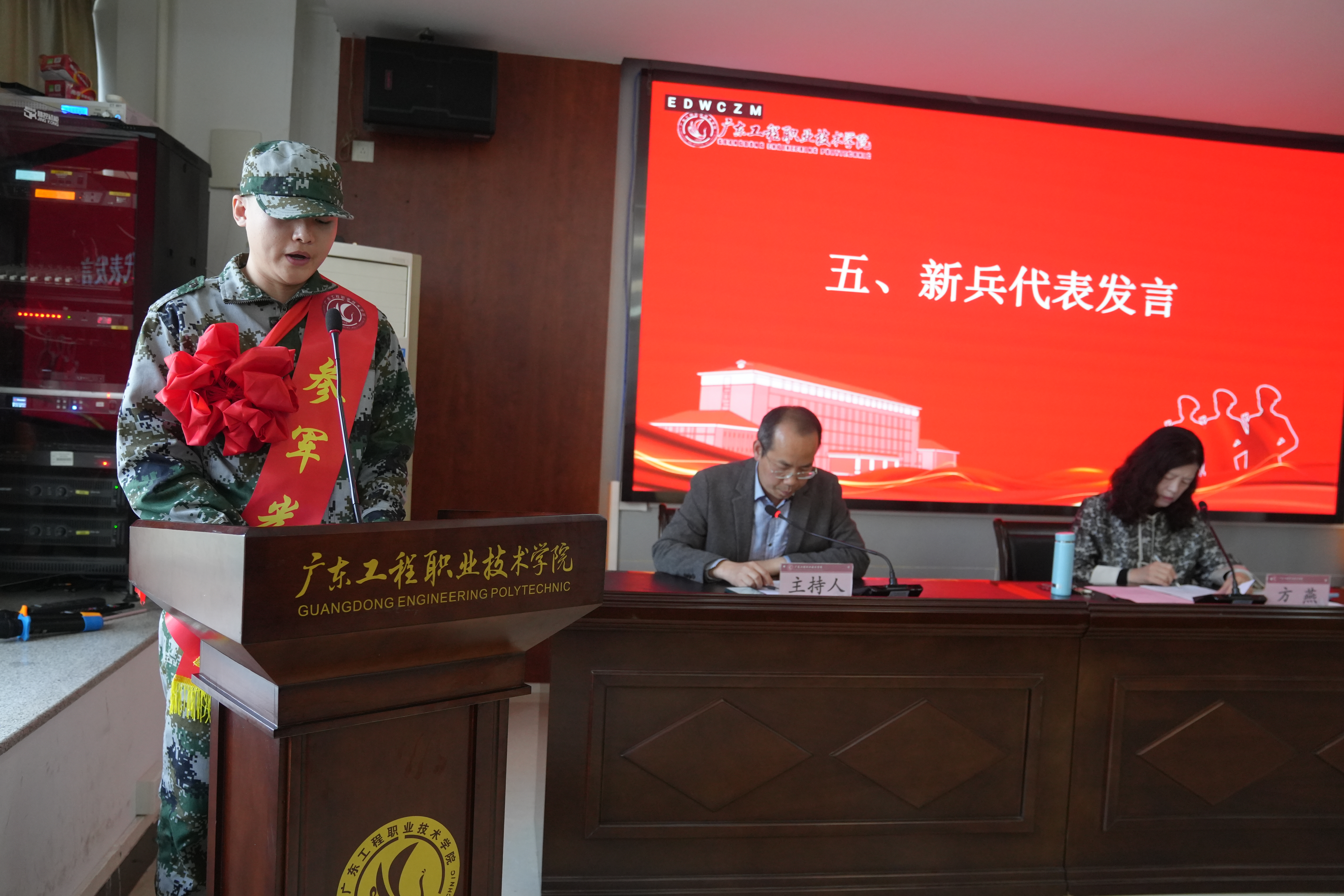 2022级建筑设计B班的管汇丰代表入伍新兵发言,表示将秉承广东工程校训,牢记人民军队的使命宗旨,服从命令,听从指挥,刻苦训练,高质量完成各项使命任务,为国防建设贡献青春力量。2024级计算机应用A班的陈泽坚代表老兵寄语新兵,在部队要坚韧不拔,懂得团结协作,理解“国之大者,为国为民”的崇高意义,用实际行动诠释“忠诚、勇敢、担当”的军人本色,为国家的和平与繁荣贡献自己的力量。全体新兵在老兵的带领下,高举右拳,共同许下坚定誓言,表达听党指挥、苦练本领、发扬优良传统的信心和决心。
