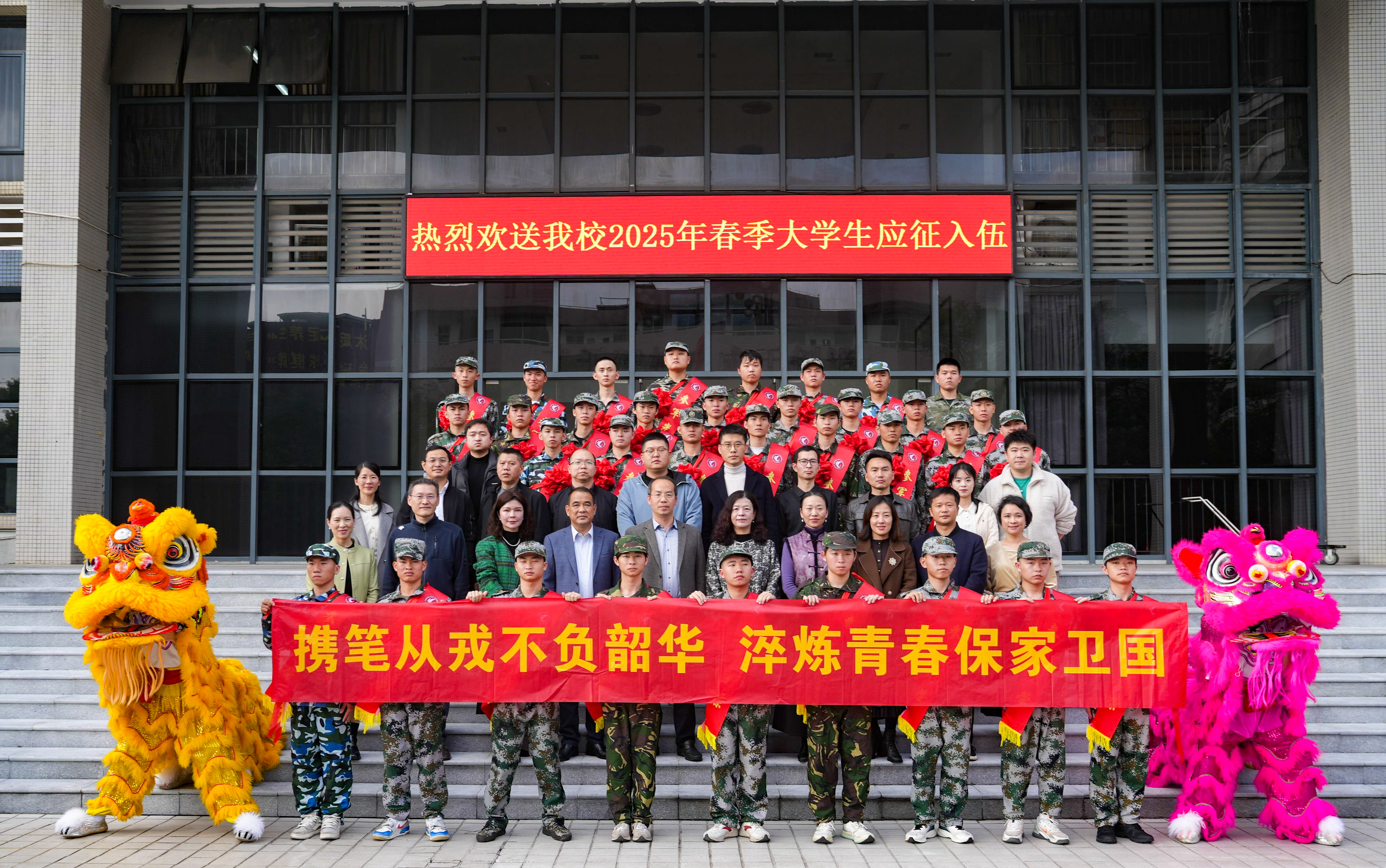 锣鼓喧天,醒狮起舞,与会领导与新兵们在办公楼前合影留念,共同记录难忘时刻。