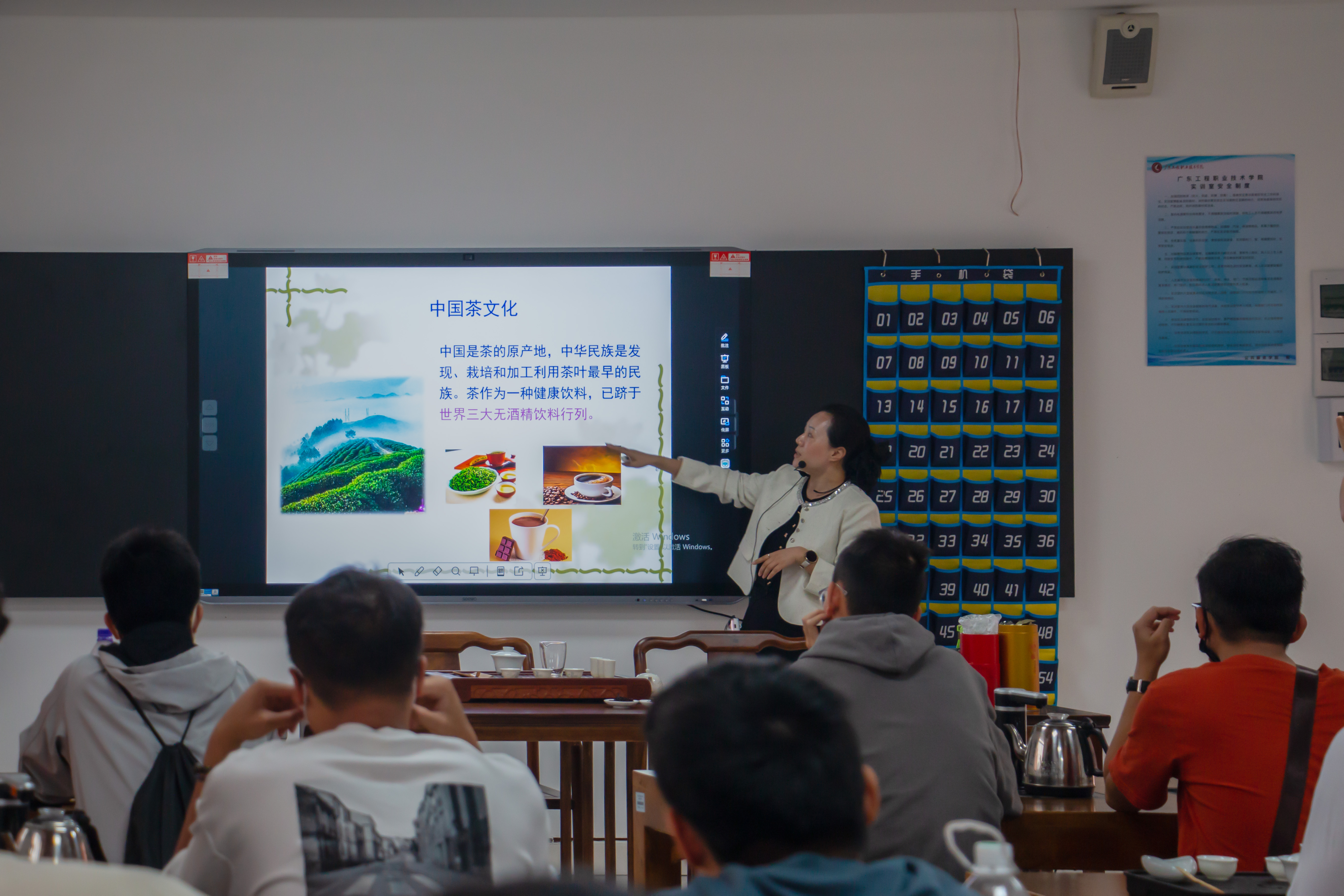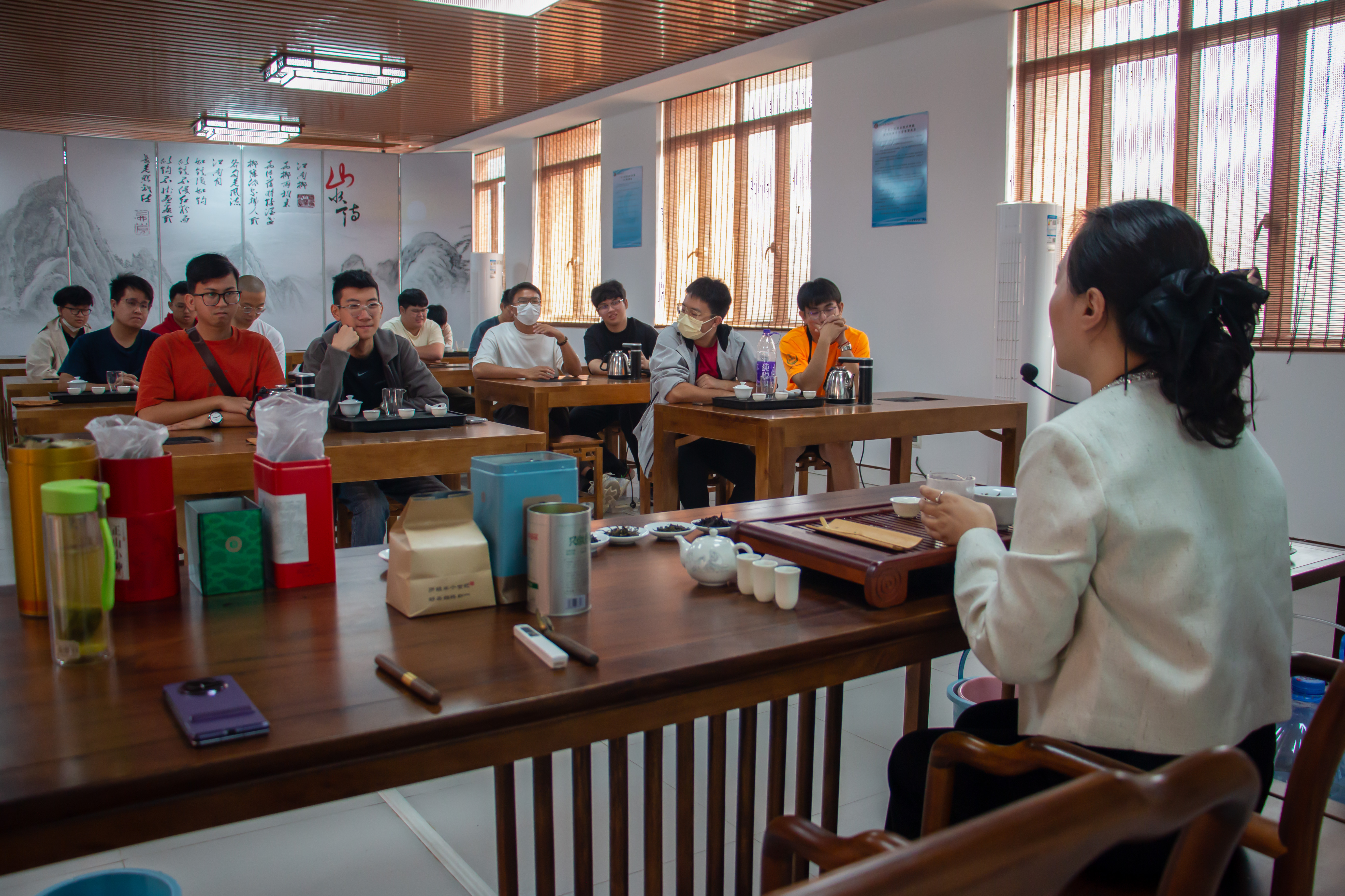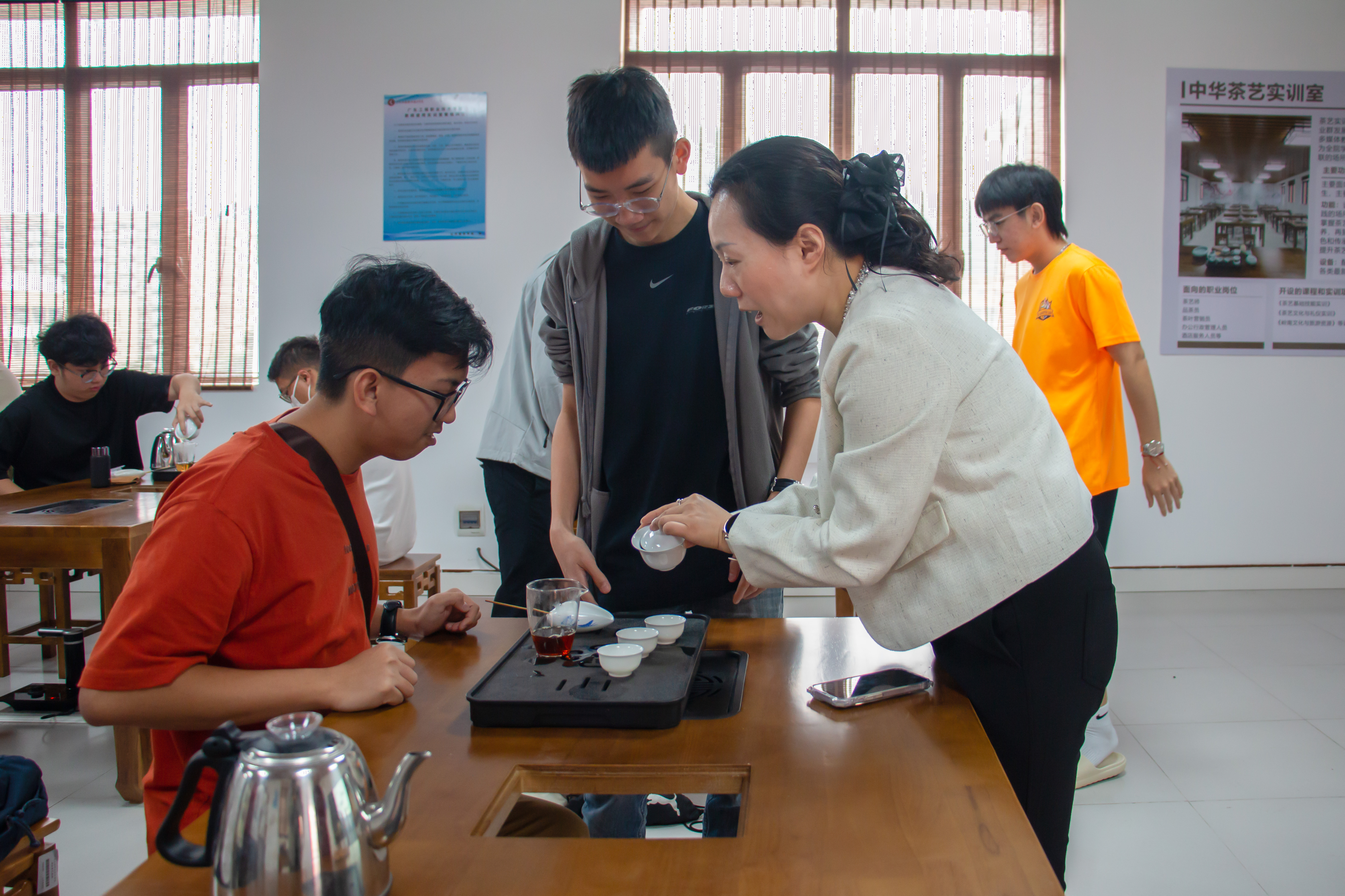 课堂上,戴老师先是带领同学们探寻中国茶文化的发展脉络,随后系统且全面地讲解了白茶、绿茶、红茶、黑茶等各类茶的产地、特点、工艺制作,特别着重介绍了广东清远的英红九号红茶这款茶的制作工艺与口感特点,为英红九号红茶的推广助力添彩。与此同时,戴老师也介绍各种茶具的用途与特点。从古朴的茶壶、精巧的茶杯,到实用的茶盘、别致的茶则,每一件茶具都蕴含着独特的文化讲究,在戴老师的讲解下,尽显深厚韵味。