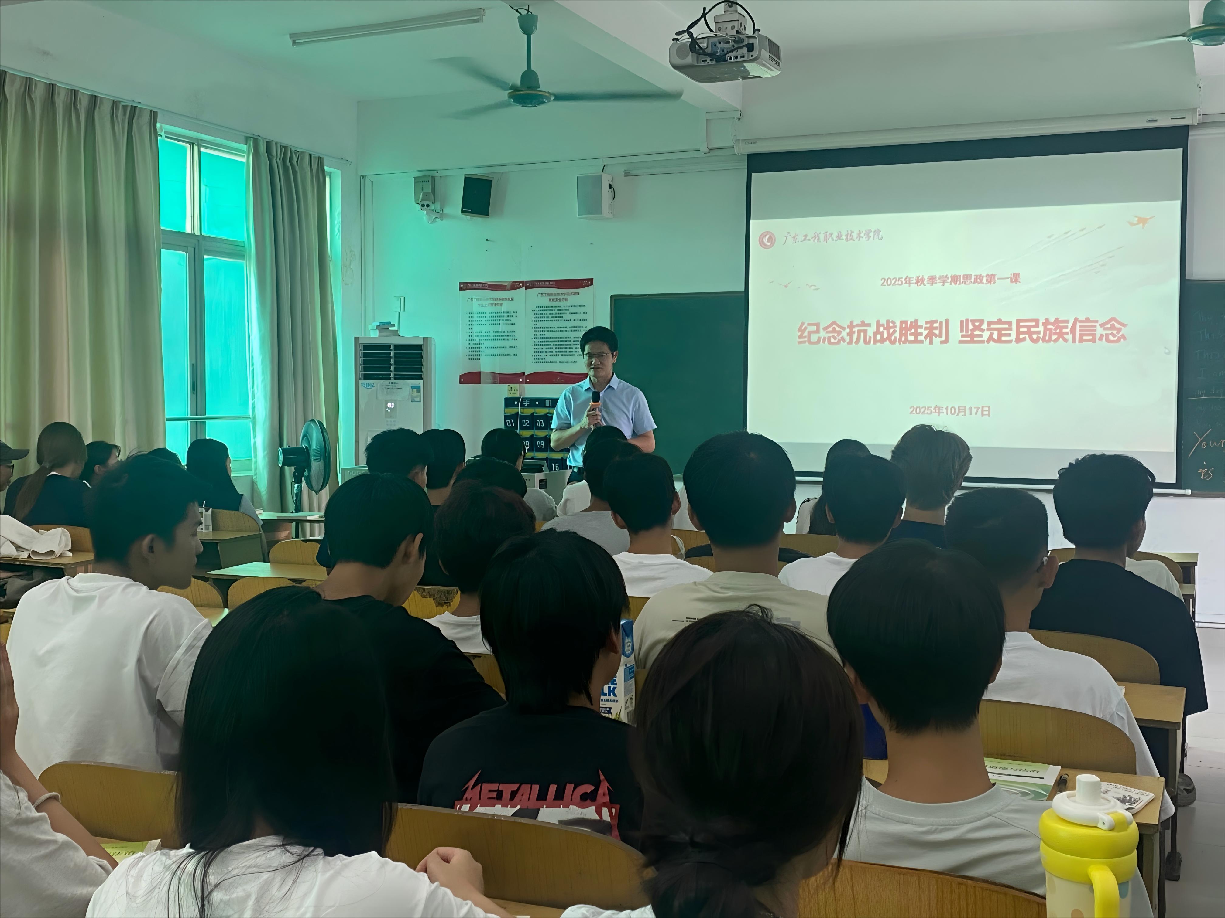 10月11日下午,学校党委委员、副校长张永强为2024级电子信息工程技术专业、新能源汽车技术专业的同学们讲授了一堂深刻而富有教育意义的“思政第一课”,授课主题为“纪念抗战胜利 坚定民族信念”。张永强副校长以厚重的历史脉络和生动的英雄事迹,从“铭记历史 正义必胜”“民族壮举 浓墨重彩”“精神丰碑 永不磨灭”“珍爱和平 开创未来”四个部分层层展开,引导同学们善于从历史中汲取智慧与力量,认识到和平来之不易,并寄语大家要坚定理想信念,将个人成长融入国家发展大局,为实现中华民族伟大复兴贡献青春力量。